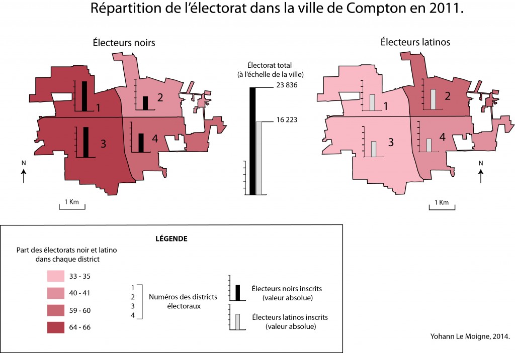 Après une longue mobilisation hispanique, le conseil municipal s’est résolu, fin 2010 à soumettre la transformation du système électoral au vote. Le passage à un système par district fut approuvé par les électeurs en 2012, ce qui permit au premier conseiller municipal hispanique de l’histoire de la ville d’être élu dans le district 2 en 2013.On a donc vu apparaître à Compton ce qui, au premier abord, semble être un développement de conflits le long de frontières raciales  entre une communauté noire devenue minoritaire qui s’inquiète de la remise en question de son pouvoir dans un contexte socio-économique extrêmement défavorable, et une communauté hispanique qui entend tirer profit de sa croissance numérique.