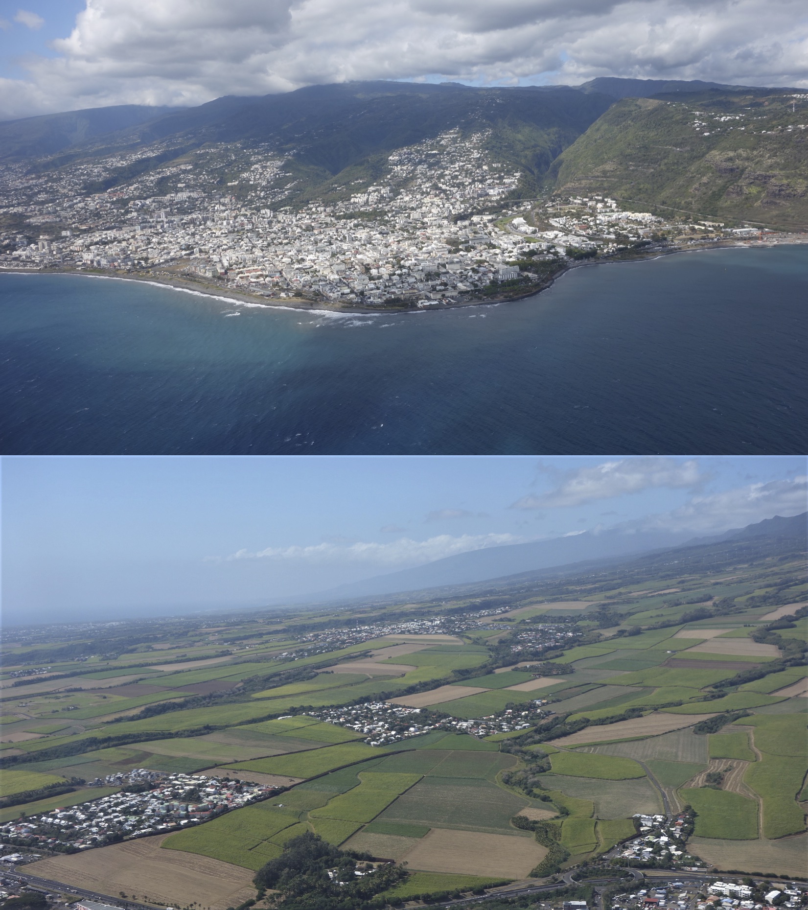 Les Ultramarins sont de plus en plus des périurbains. La diffusion de l’habitat sur des îles exiguës et dans les zones rurales faiblement occupées se fait aux dépens de la surface agricole utilisée (SAU), qui s’est fortement contractée ces dernières décennies. La SAU de la Martinique est ainsi passée de 52 000 ha en 1973 à moins de 25 000 ha aujourd’hui. La perte de foncier agricole s’est accélérée depuis 2000 et elle est beaucoup plus forte qu’en métropole. Dans le tissu agricole, des lotissements isolés apparaissent, formant des structures en archipel comme c’est le cas à la Réunion (cf. photo). Outre la consommation de terres agricoles, cette urbanisation diffuse engendre des coûts élevés de fonctionnement et d’investissement, ce qui explique que parmi les principes du schéma d’aménagement régional de la Réunion on note la volonté de densifier les agglomérations et de limiter leur extension. À Mayotte, 30 % des logements n’ont pas l’eau courante et les bidonvilles se multiplient. Les logements précaires, en matériaux de récupération et en tôle, sont présents dans la plupart des communes, spécialement à Mamoudzou où plusieurs opérations de destruction de zones d’habitations précaires et informelles, telle Tanafou en 2016, ont été menées et des centaines de personnes ont dû « décaser ». Mangatélé et ses 11 000 habitants est considéré comme le plus grand bidonville de France.