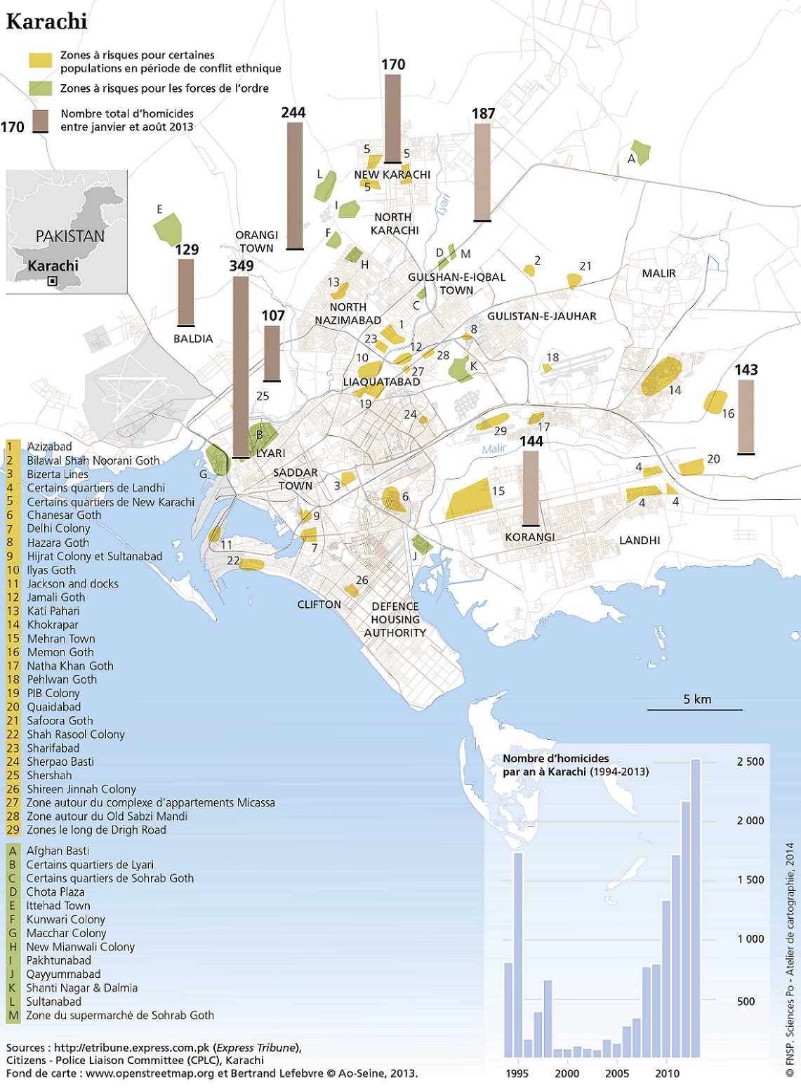 Carte des homicides et des zones à risque à Karachi (2013) (Atelier de cartographie de Sciences Po, 2014)