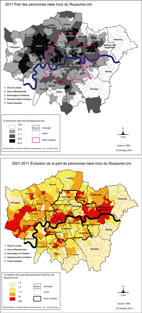 L’idée dans mon travail était donc d’essayer de montrer comment les évolutions socio-démographiques des quartiers péri-centraux, les territoires de ce qu’on appelle l’inner city, était « travaillés » par ces deux mouvements de fonds et comment réagissent – spatialement – les populations qui se trouvent prises malgré elles dans ces dynamiques. Donc pour capter l’internationalisation de la population habitante londonienne, j’ai choisi de ne pas travailler sur les statistiques ethniques mais d’utiliser la variable « part des habitants nés à l’étranger ». Cela me permettait de capter aussi l’immigration des personnes qui entrent autrement dans la catégorie générale « White ».