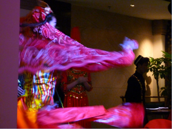 Le restaurant se propose ainsi comme nouveau point-relai de démonstration de la culture ouighoure, nouvelle scène de redéfinition identitaire, lieu de négociation d’une image sociale positivée, mais pour le moins paradoxale : attirant la clientèle en jouant sur l’image officielle des Ouighours comme peuple chanteur et danseur, la musique est aussi utilisée comme vecteur central de revendication et sentiment de différenciation. La danse, elle, permet d’opérer un renversement des imaginaires : là où l’image officielle tend à féminiser les minorités ethniques périphériques, les danseurs se plaisent à sur-jouer la virilité, consacrée lorsque les clients Han sont malicieusement tirés sur scène pour prendre part à ces danses qu’ils ne maitrisent pas. Mais le Uyghuristan a aussi été victime de son succès : sa rapide expansion a suscité la méfiance et la moitié des restaurants ont dû fermer, pression politique oblige. Le premier, Place du Peuple, n’existe plus, un autre a été détruit avec d’autres restaurants environnants pour rouvrir dans des locaux plus petits et sans scène de danse.