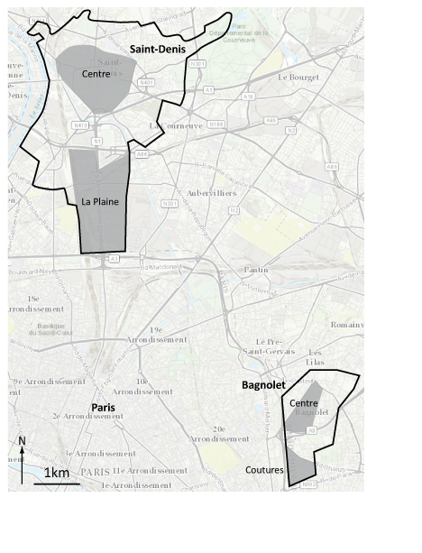 Nous nous appuyons sur le matériau issu d’une enquête de terrain1 réalisée à Bagnolet et à Saint-Denis entre 2009 et 2014. Des entretiens semi-directifs avec des ménages des classes moyennes visaient à saisir les déterminants de leur choix résidentiel ainsi qu’à caractériser les modalités de leur inscription territoriale et à qualifier leur rapport au quartier et à la mixité sociale. Les entretiens ont été menés dans quatre quartiers marqués par une progression des catégories moyennes-supérieures depuis les années 1990 : les centres anciens de Bagnolet et Saint-Denis, le quartier neuf de la Plaine Saint-Denis, le quartier des Coutures au sud de Bagnolet.