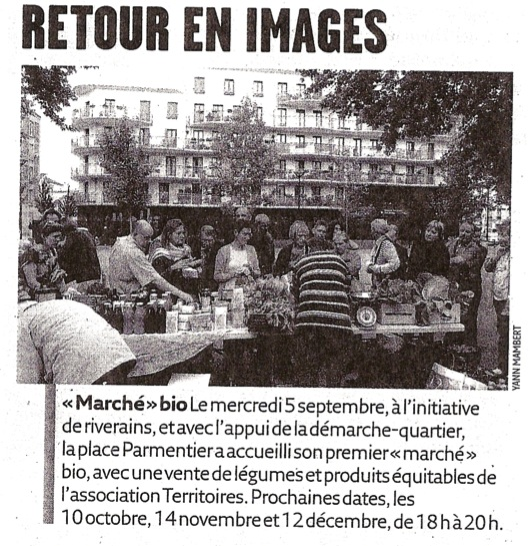 Michèle, très investie dans le quartier, a joué un rôle central dans le groupe de travail et a proposé de mettre en place un petit marché biologique. Ce marché s’est tenu tous les mois sur la Place Parmentier de septembre 2007 à janvier 2009, et la directrice de quartier assurait la communication autour de cet événement pour qu’il attire des habitants.