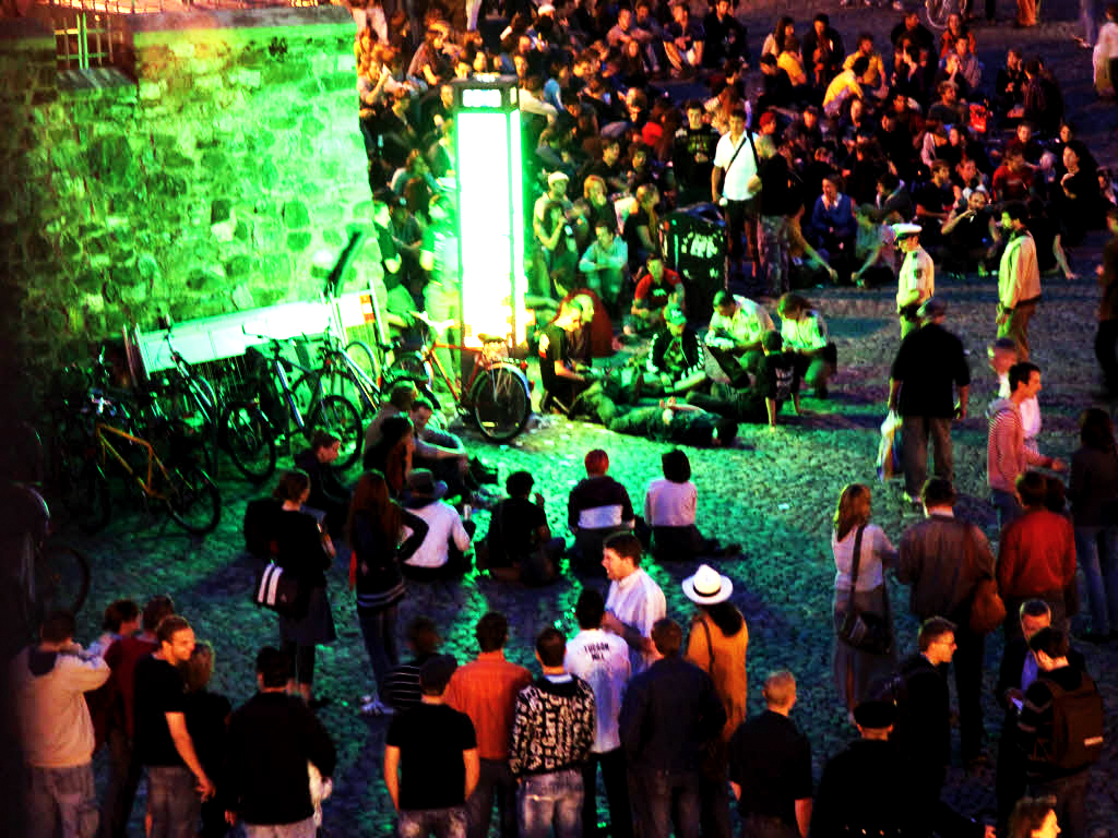 L’exemple de la « colonne de la tolérance » (Saüle der Toleranz) mise en place par les autorités de la ville de Freiburg en Allemagne en 2010, dont la possibilité de test a été évoquée lors d’une réunion du collectif des tenanciers de la rue, est utile pour comprendre la manière dont les acteurs font preuve de compétences et de résistances face aux objets. Celle-ci est une colonne lumineuse dont les couleurs varient en fonction du bruit enregistré. Sur la Augustinerplatz, haut-lieu de noctambulisme de la ville de Freiburg, la couleur verte de la colonne indique un seuil de nuisance sonore acceptable alors que quand celle-ci vire au rouge, le seuil d’acceptabilité du bruit est dépassé. En qualité d’actrice autonome dans la régulation du bruit, elle est imaginée par les autorités comme complémentaire à la présence policière sur la place.