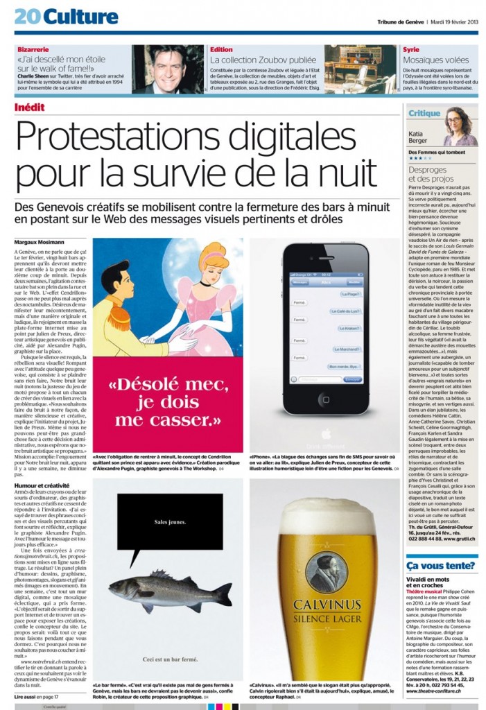 Il s’ensuit une vague de protestations digitales pour « manifester de manière silencieuse, grâce à la création, pour la liberté d’expression nocturne et démontrer que Genève est solidaire et créative21 ».