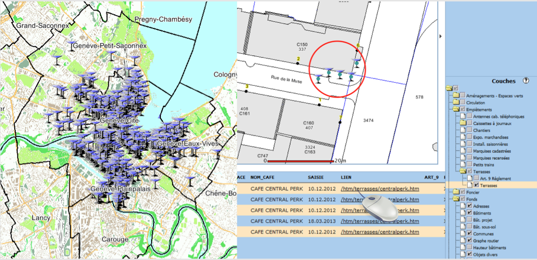 A l’échelle de la ville, une base de données est créée pour d’une part, identifier les établissements ouverts jusqu’à deux heures du matin et d’autre part, pour enregistrer les mesures prises et interventions effectuées par les agents de la police municipale pour chaque établissement. La base de données est couplée à un système cartographique qui selon une des responsables du système à l’avantage de donner « une vision d’ensemble et rapide des établissements à problèmes » (DEUS, entretien n°3, 2013). L’application est conçue pour identifier les empiétements22 des différentes terrasses et ainsi s’assurer qu’elles soient conformes aux autorisations délivrées.