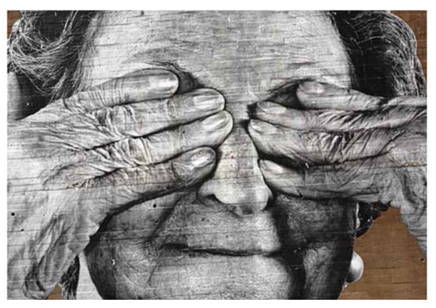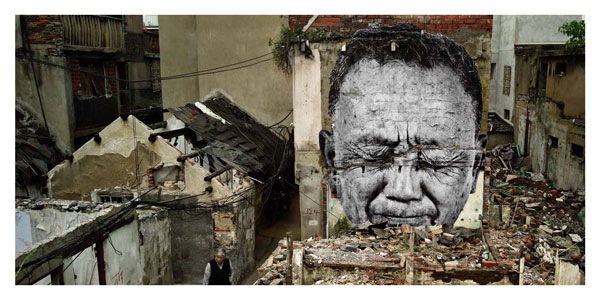 Le dernier lien suggéré au sein des photos entre les vieux murs et les Hommes mûrs touche à l’oubli et aux débris. JR semble ici sensibiliser aux amnésies qui nous menacent en exposant des paysages sans visages : débris de destruction qui ne disent plus rien ou ne font que laisser deviner des formes anciennes aujourd’hui illisibles, une vieille télévision cassée au milieu d’une décharge, des murs et des visages dont les traits premiers sont peu à peu effacés tels des palimpsestes par l’usure ou recouverts d’échafaudages signant leur mort proche.