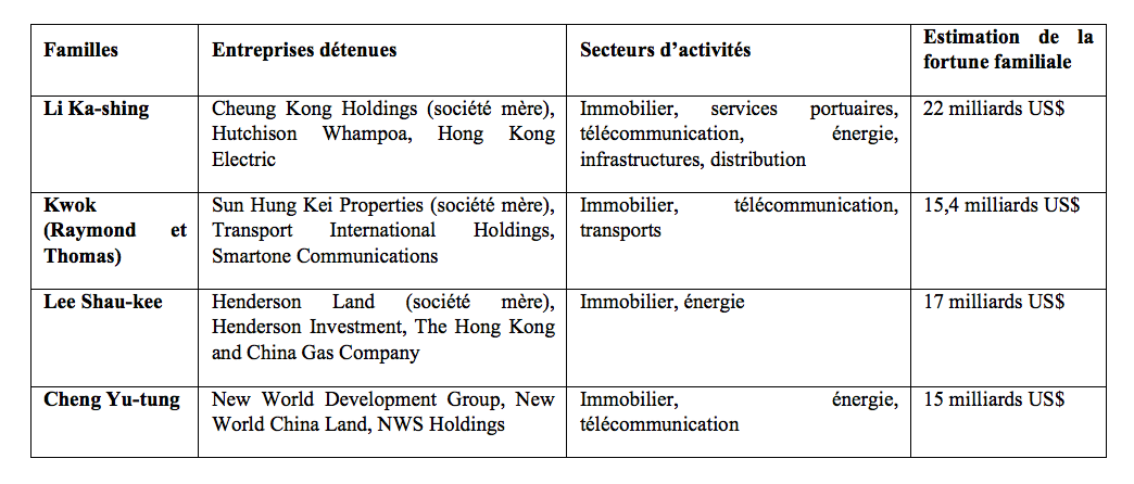 Quatre grandes familles dominent les élites économiques hongkongaises : Li Ka-shing, Kwok, Lee Shau-kee et Cheng Yu-tung. Elles détiennent des groupes d’investissement et contrôlent ainsi une grande partie de l’activité économique. Ces tycoons profitent de positions quasi oligopolistiques dans la plupart des secteurs touchant la vie quotidienne, notamment la fourniture de services publics (transports publics, gaz, électricité), la grande distribution, la télécommunication et le logement (voir tableau 1). Ainsi pour la période allant de 1991 à 1994, 55 % des logements neufs ont été fournis par ces quatre groupes (Consumer Council of Hong Kong, 1996) et en 2012 la proportion a même atteint 74 % de la production totale4 .