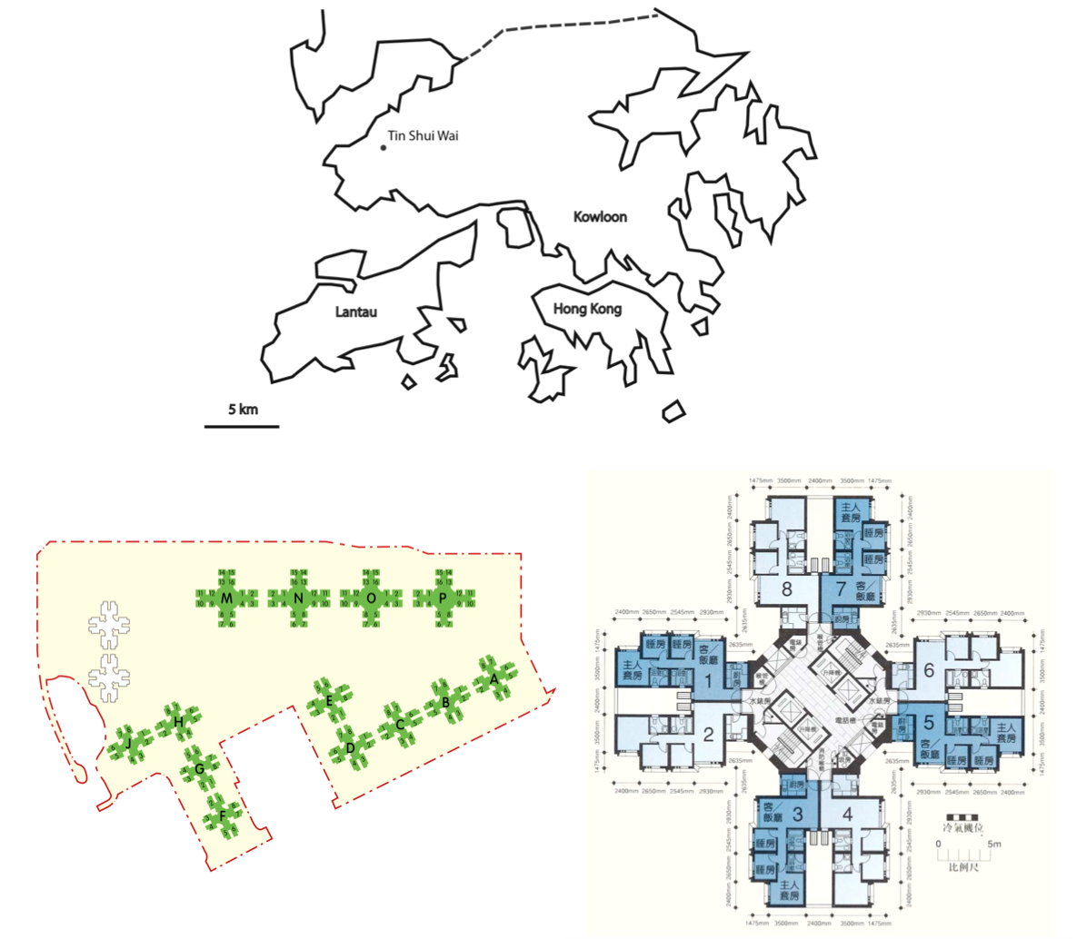 4. Localisation de Tin Shui Wai (Douay, 2015), plan d’implantation des tours du quartier de Tin Chung Court et distribution des logements d’une tour (À partir de données de la Hong Kong Housing Authority)