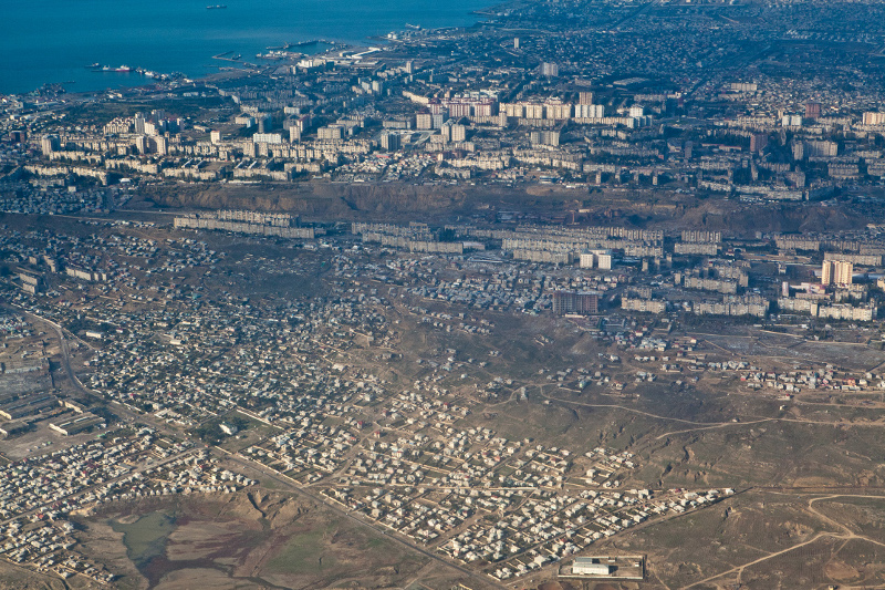 Vue aérienne de Zig, la banlieue est de Bakou, les habitats collectifs soviétiques organisés en micro-raïon autonome juxtaposés aux maisons récentes de l’extension urbaine. http://www.panoramio.com/photo/70503671 (A. Cheban 2012)