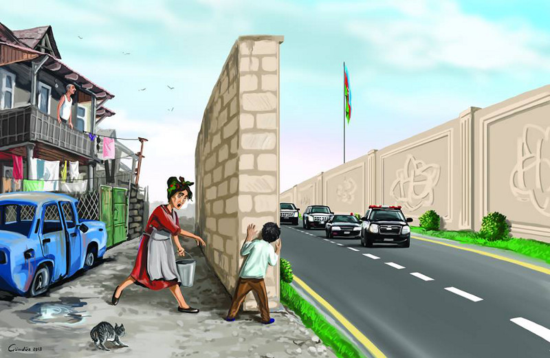 Cette caricature illustre le ressentiment d’une partie de la population vis-à-vis des dirigeants politiques. En effet, les bidonvilles qui se sont constitués depuis l’indépendance dans les espaces vides du tissu urbain de Bakou sont souvent cachés aujourd’hui derrière des murs cache-misères, désignés ironiquement par les opposants comme une « ceinture de la prospérité » (LEVINE, 2012). Cela rejoint le sentiment assez répandu que la « bataille pour le centre-ville » est déjà perdue par la majorité de la population bakinoise au profit de l’élite fortunée5. Du fait de l’importance des richesses créées par l’exportation des hydrocarbures depuis dix ans, les attentes de redistribution des personnes les plus modestes comme des classes moyennes sont grandes. Mais constatant l’exclusion visuelle du paysage urbain de la catégorie la plus pauvre de la population de Bakou, ceux qui sont exclus socialement (pauvres, prolétaires et réfugiés de la guerre – préciser de quelle guerre) comme ceux qui sont exclus du jeu politique (anciens intellectuels de l’époque soviétique, jeunesse pro occidentale, nationalistes panturcs, islamistes) accusent le pouvoir politique, qui se confond avec les milieux d’affaires, de s’approprier la ville pour son usage exclusif. C’est en tout cas le discours de l’opposition comme des chercheurs en sciences sociales et des experts du secteur de l’aménagement urbain6.