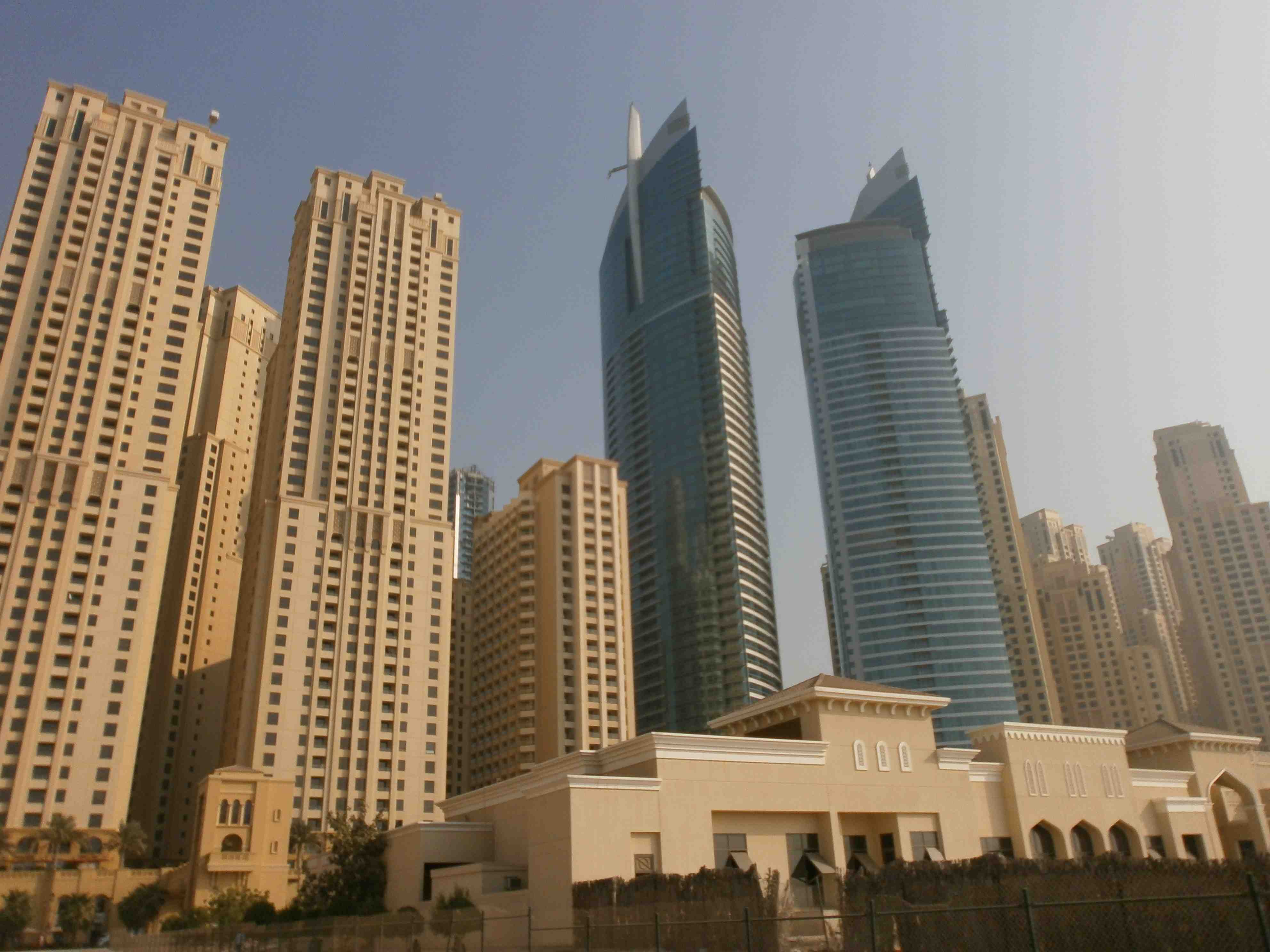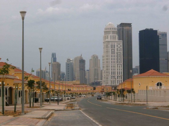 Une résidence récemment livrée par le promoteur immobilier à Jumeirah Park , au second plan les immeubles de grande hauteur de Jumeirah Lake Towers (C. Montagne, mai 2013)
