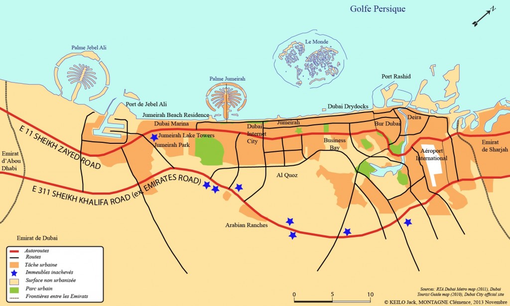 Il est sans équivoque que le territoire de Dubaï, le paysage urbain et la société urbaine ont été violemment affectés par la « crise globale » (entretien, responsable de l’aménagement, municipalité, juin 2013), financière, immobilière et économique. Pour les acteurs rencontrés qui ont des responsabilités importantes dans les ministères, ce qui est arrivé à Dubaï était indépendant de la volonté des responsables de l’aménagement et de l’urbanisme, c’était imprévisible « en 2007 et en 2008 les études des consultants ne s’attendaient pas à une crise d’une telle ampleur » (entretien avec un consultant en aménagement, septembre 2011).