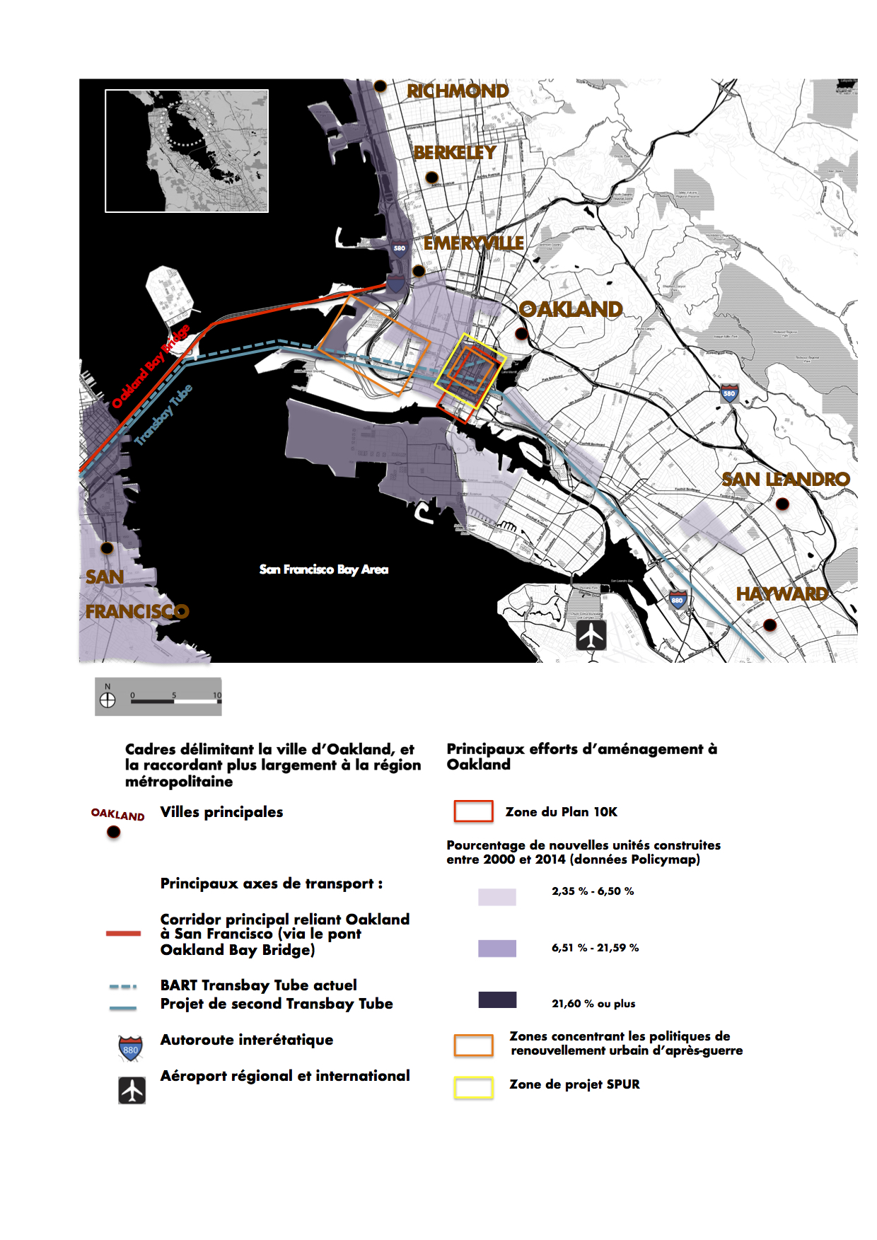 Cela se confirme par le premier thème sur lequel SPUR a choisi de travailler, afin d’accompagner les investissements croissants de compagnies de la tech dans la ville : downtown Oakland. Les raisons sont nombreuses : c’est le lieu où la ville a vu le jour, c’est le nœud du réseau de transport local (Terplan & Maaoui, 2015). L’agence SPUR espère ainsi mesurer pleinement les enjeux du « tournant d’Oakland », et la façon dont ils sont visibles dans la trajectoire actuelle de développement du downtown, comme centralité nouvelle au cœur d’un système urbain régional.