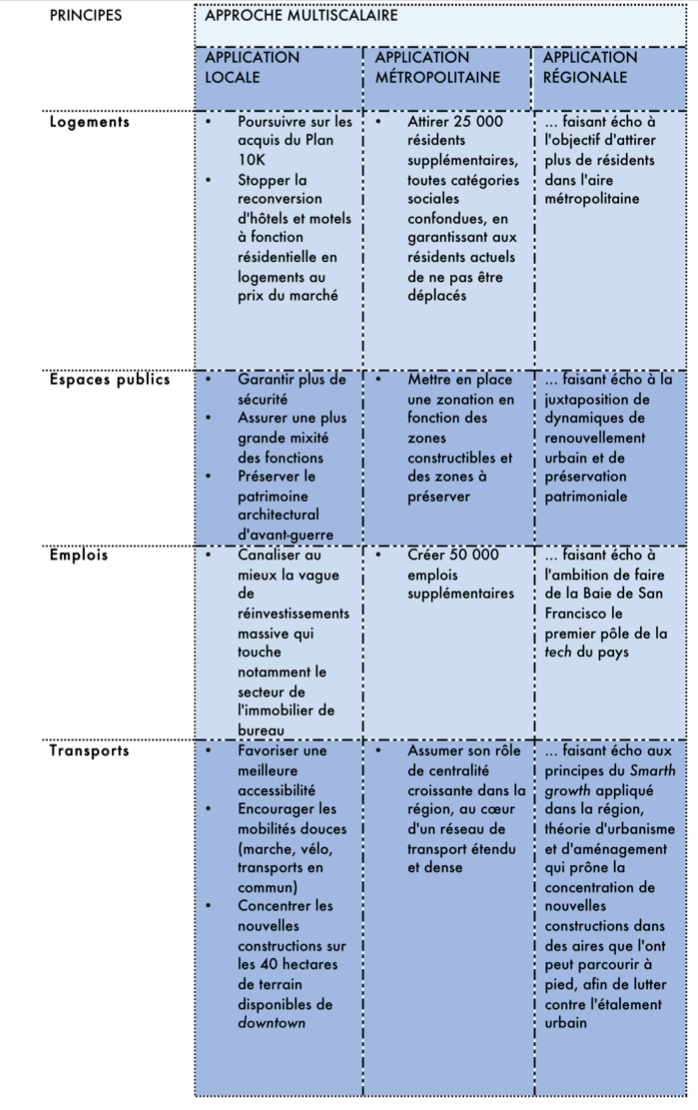 Les techniques de travail de SPUR sont héritées du tournant participatif des années 1980 : petites équipes de travail collégiales, consultation régulière de tous les acteurs de l’aménagement de la région mais qui sont extérieurs à l’agence. Cela concorde avec le fait que le gouvernement de la ville soit actuellement en train de préparer son sixième Neighborhood Specific Plan pour le centre-ville. Ce plan est important car il doit déterminer par exemple la part de foncier allouée à des surfaces de bureaux, à des fonctions commerciales, ou encore la part de futures unités de logement aux prix du marché et celle du logement social. Si ce projet cible avant tout le downtown, il est clairement inscrit dans un effort d’aménagement régional, et traduit une conviction (de la part de SPUR, mais aussi des décideurs locaux et régionaux impliqués) de la centralité retrouvée d’Oakland. Cela peut être résumé par le tableau suivant, qui souligne combien les ambitions d’aménagement de SPUR pour le downtown se font avant tout l’écho de directives à l’échelle métropolitaine et régionale. Ces principes ont déjà été formulés dans d’autres plans locaux. De ce fait, parler du tournant d’Oakland, c’est aussi s’interroger sur le degré d’innovation des plans d’aménagement actuels : peut-on ici parler d’alternatives aux propositions formulées par le gouvernement local ? La collaboration entre acteurs des trois villes, sans segmenter la région métropolitaine, constitue-t-elle une innovation viable, et surtout faisable ?