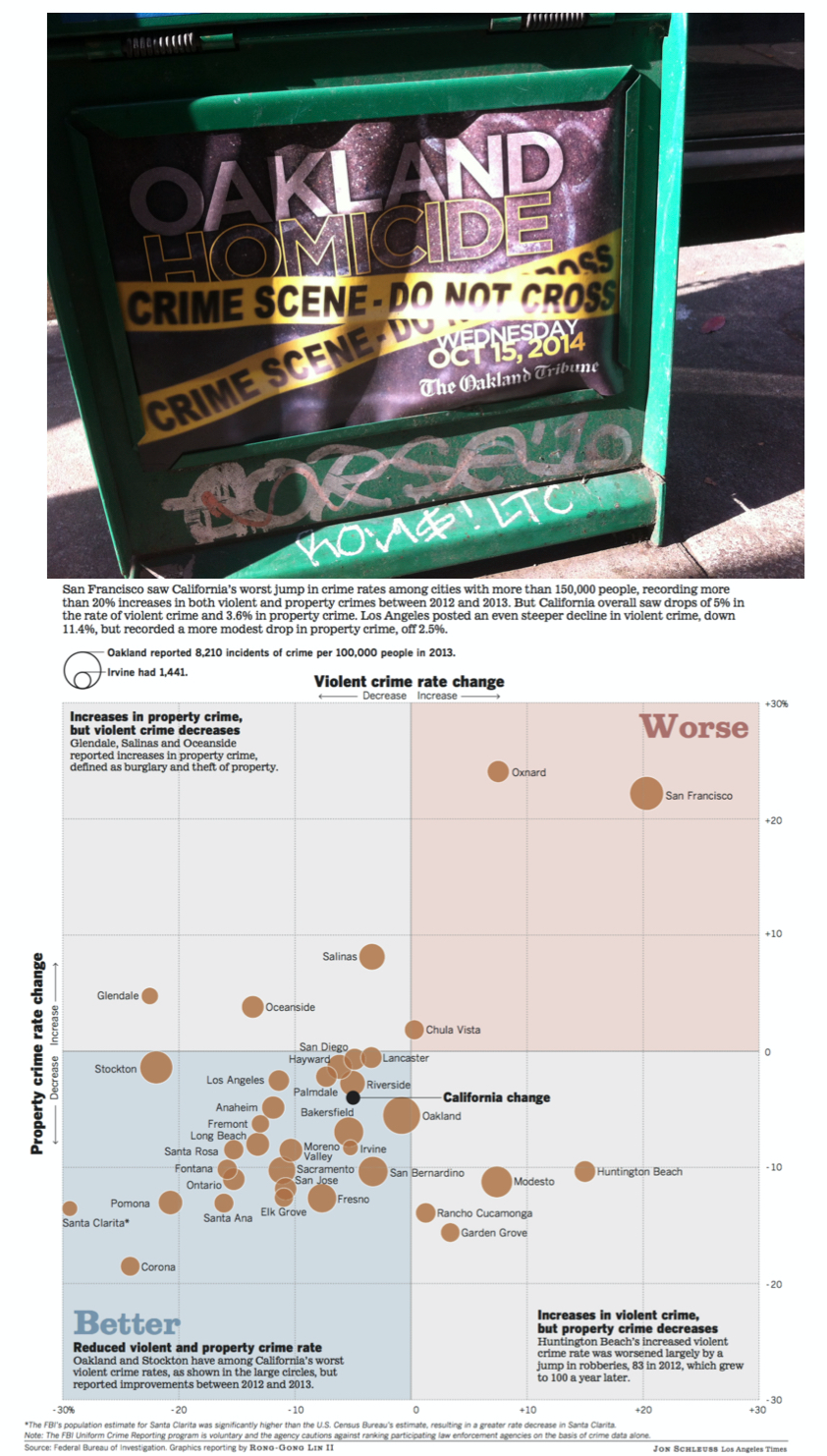 2. Publicité pour un numéro spécial du Oakland Tribune sur les hauts-lieux du crime affichée à North Oakland (Maaoui, 2014) ; Carte de l’évolution du crime dans l’État de Californie et dans ses principales villes (Los Angeles Times, 2015)