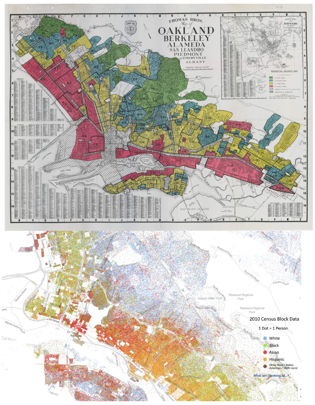 4. Carte instaurant le redlining à Oakland (Federal Housing Administration, 1936) ; Carte raciale du Weldon Cooper Center – University of Virginia à partir de l’US Census 2010 soulignant la permanence de la répartition spatiale des minorités des décennies plus tard, quasi-calquée sur les logiques de redlining (Weldon Cooper Center, 2013)