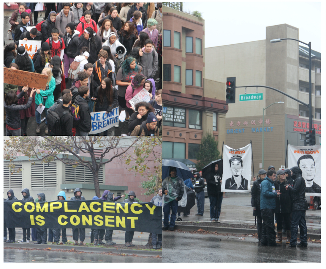 9. Manifestations du mouvement Black Lives Matter devant l’Oakland Police Department (gauche ; droite, en bas) – devant le lycée du quartier de Fruitvale (Maaoui, 2015)