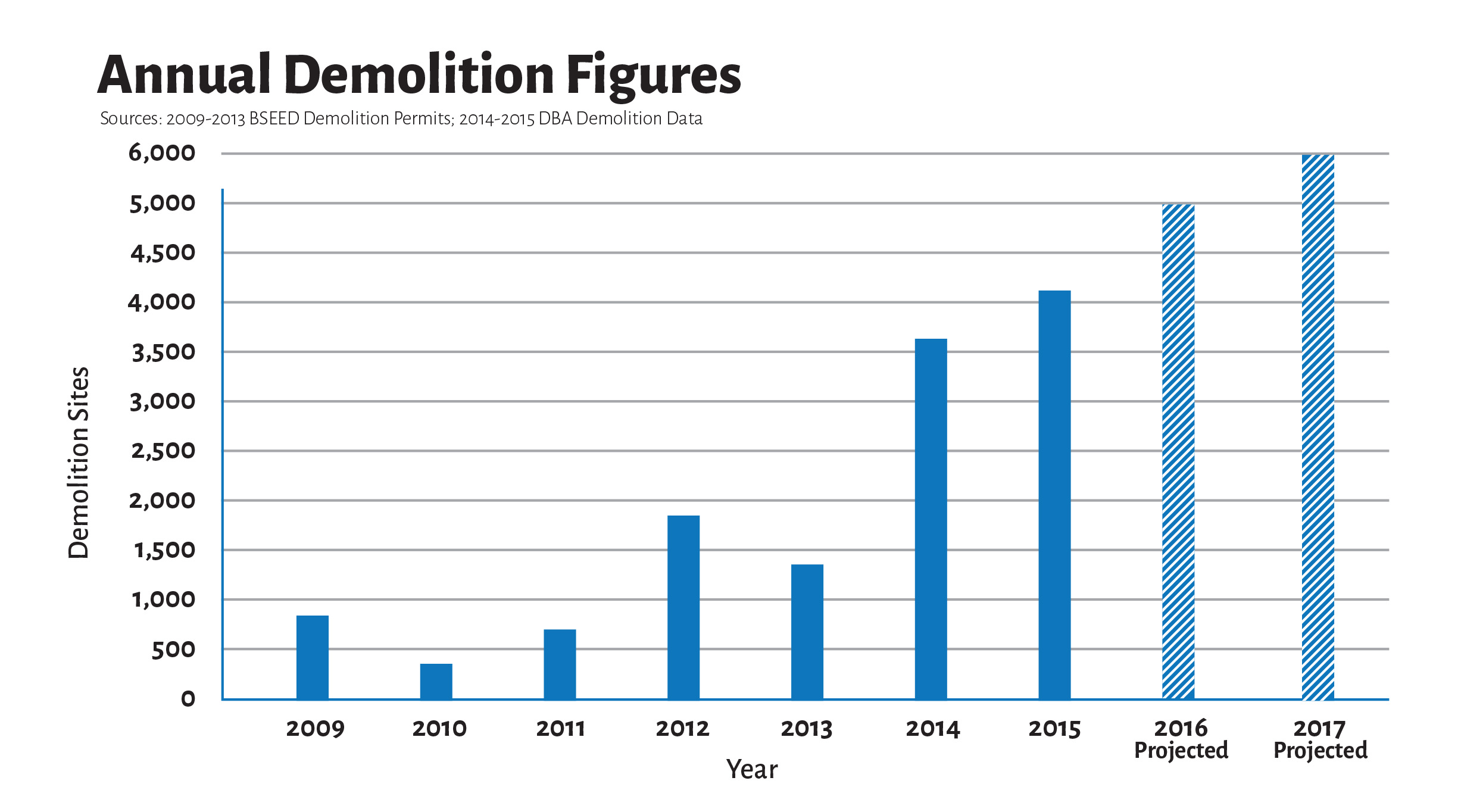 4. Évolution du nombre de structures démolies par la municipalité depuis 2009 et prévisions pour 2016-2017 (Ville de Detroit, 2016)
