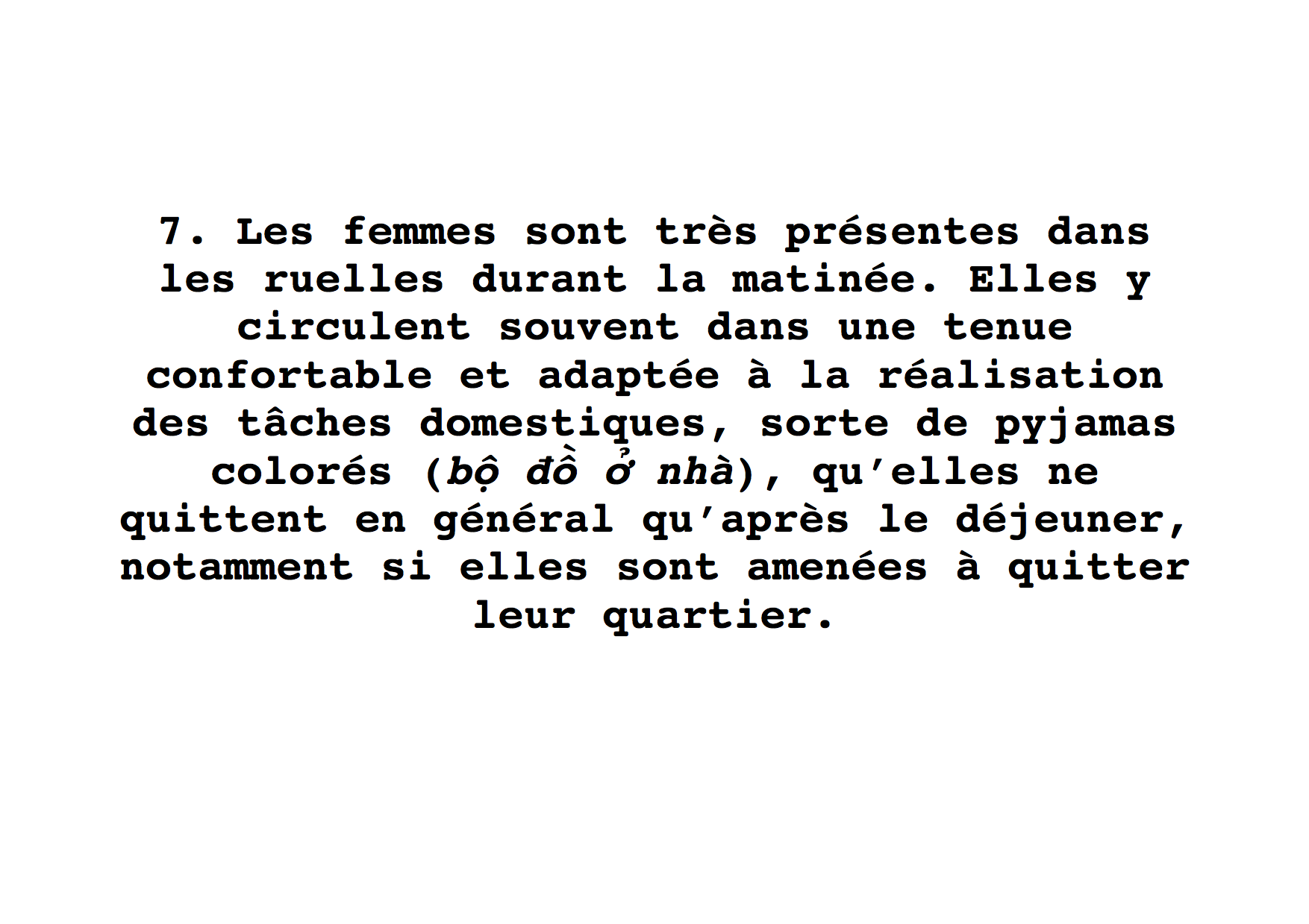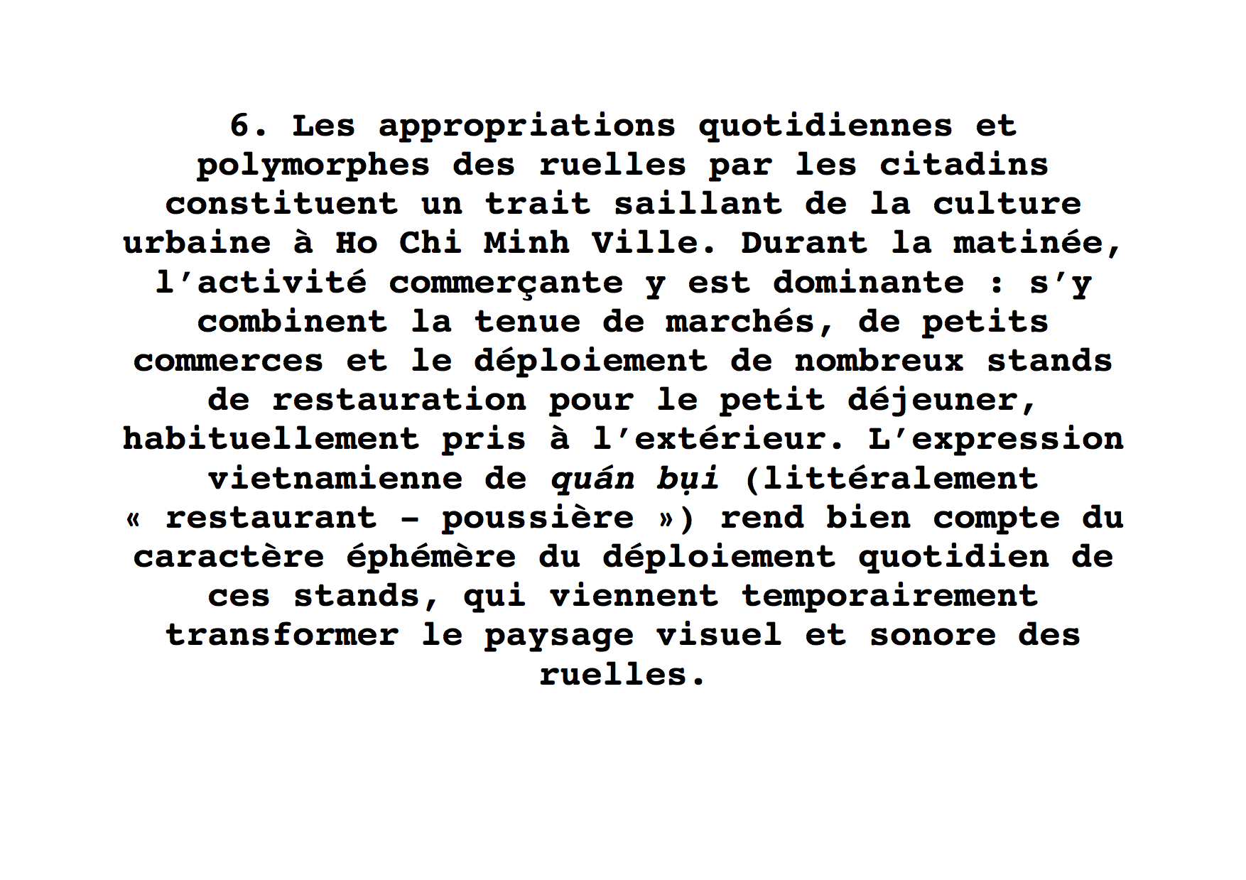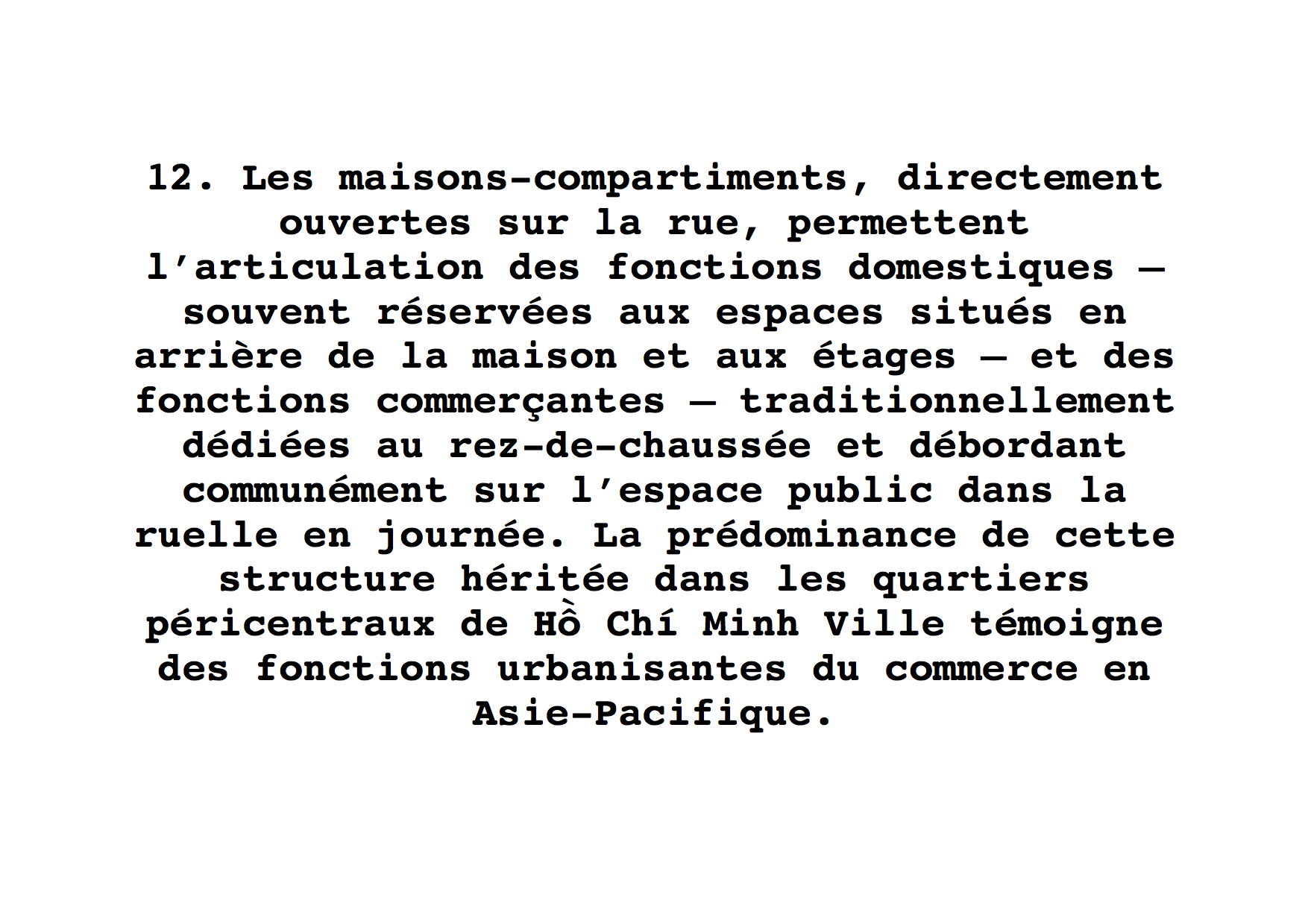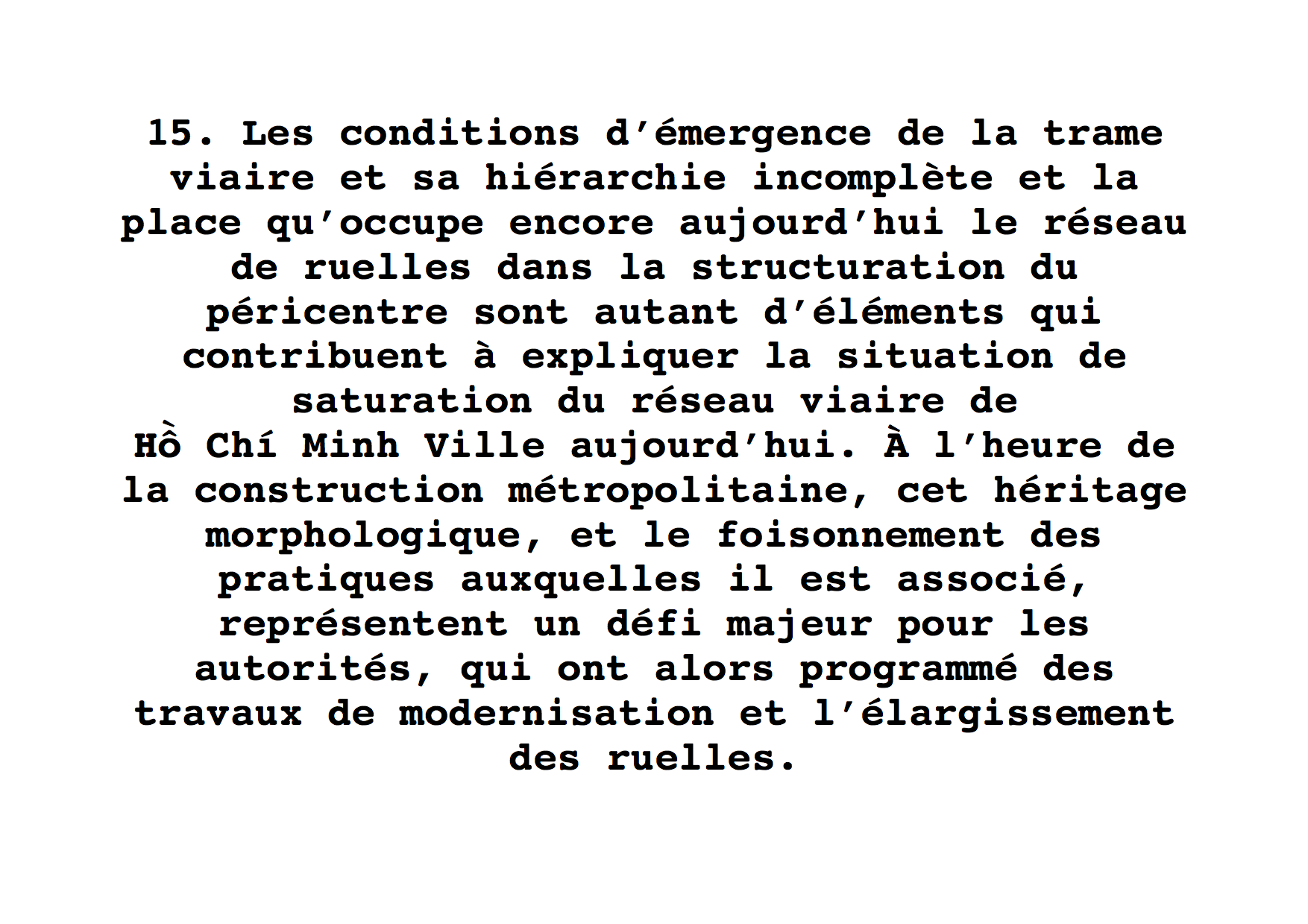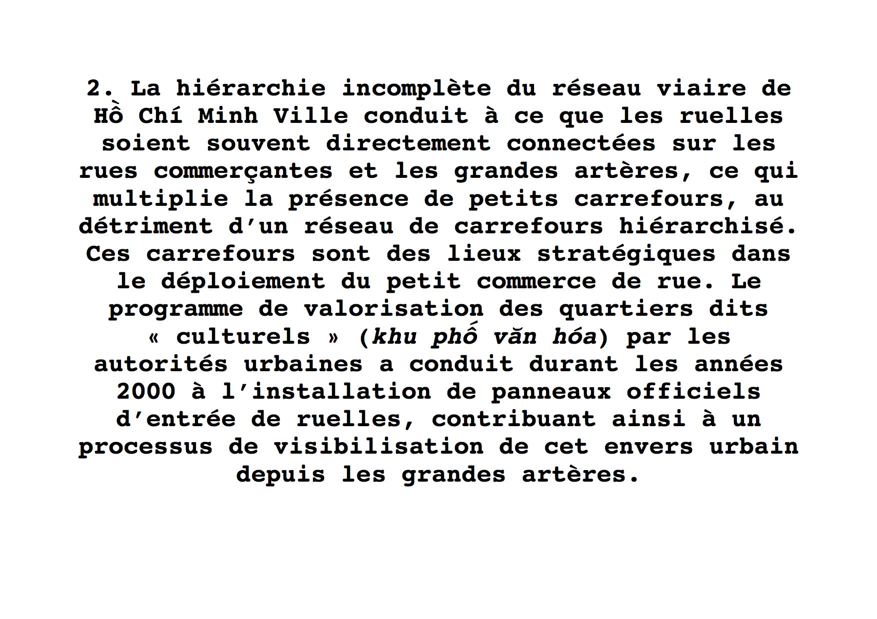 Porter le regard sur les quartiers de ruelles permet de souligner la diversité des configurations socio-spatiales, des types morphologiques, et des processus d’adaptation à la modernité métropolitaine à Hồ Chí Minh Ville aujourd’hui. Les mutations de cet « envers urbain », bien qu’invisibilisées dans les productions cartographiques comme dans les discours des autorités urbaines, permettent de prendre la mesure des effets polymorphes des processus de métropolisation dans les « quartiers ordinaires ».