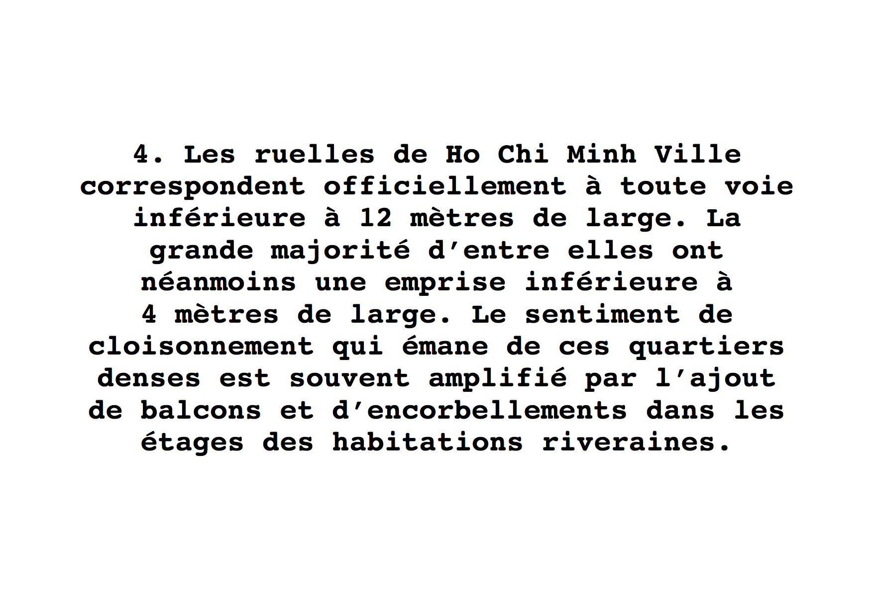 Les ruelles (hẻm) forment ainsi le cœur de l’armature urbaine de Hồ Chí Minh Ville et constituent aussi le cadre de vie de la grande majorité de sa population. Elles se caractérisent par leur étroitesse : officiellement, une ruelle est une voie inférieure à 12 m de large, mais elles sont souvent bien plus étroites. Elles sont également associées à l’absence de trottoir et à la sinuosité de leur tracé irrégulier, pouvant nourrir un sentiment de cloisonnement, amplifié par l’extrême densité du bâti qui la borde. Le processus de densification de la ville a en effet été principalement guidé par l’impératif d’accès à la rue de chacune des habitations, dans une optique commerçante ; cela s’est traduit par la juxtaposition de maisons-compartiments mitoyennes, le long de ruelles de plus en plus étroites. Ces quartiers accueillent ainsi de très importantes densités de population, allant jusqu’à plus de 80 000 hab./km². La genèse informelle de ces ruelles est liée à l’instabilité politique qui caractérise l’histoire de la ville et à sa croissance non maîtrisée, qui aboutirent à la densification extrême des îlots bâtis et à des extensions urbaines non planifiées, le long des anciens chemins vicinaux.