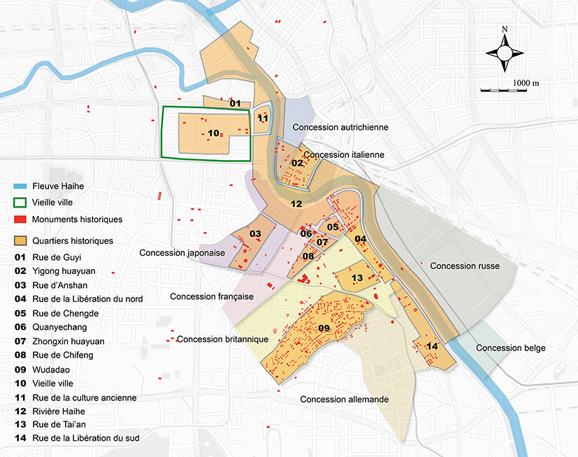 Tianjin possède un vieux quartier chinois mais aussi 86 anciennes concessions occidentales. Depuis 2005, la municipalité a identifié 877 monuments historiques à sauvegarder, inscrits sur 6 listes7 (Municipalité de Tianjin, 2013) et 14 quartiers historiques (Bureau d’urbanisme de Tianjin, 2005). 9 parmi ces 14 quartiers historiques sont situées dans les concessions.