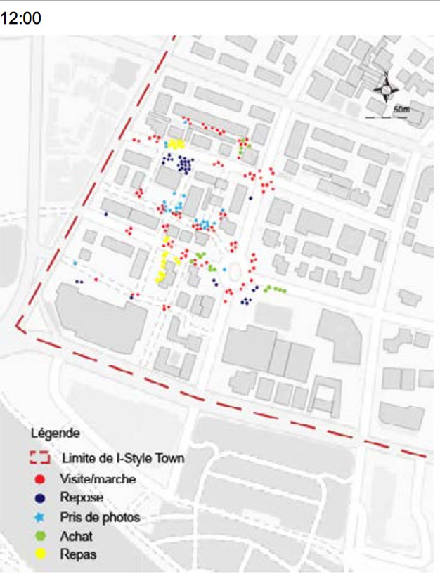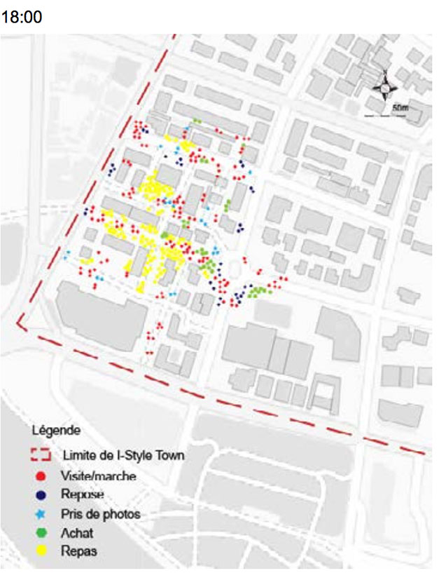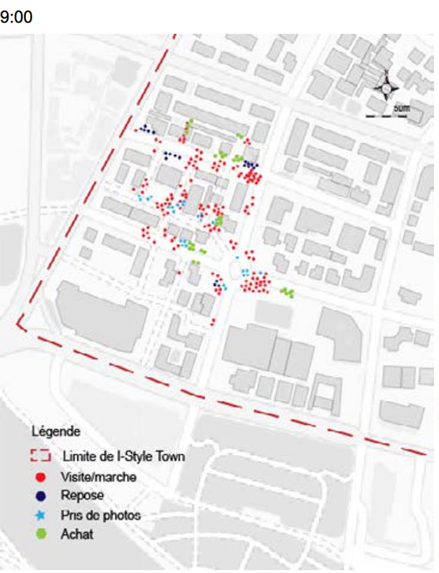 4. Les pratiques de visite dans les rues piétonnes de New I-Style Town (. On constate des pratiques distinctes selon les périodes de la journée. À 9 heures du matin, les touristes en groupe arrivent en masse, et prennent des photos depuis les points touristiques présentés par leurs guides. À midi, alors que les touristes en groupe sont partis, les visiteurs individuels arrivent peu à peu, et préfèrent se reposer sur les bancs à l’ombre. La fin de la journée est le moment le plus dynamique du quartier : de nombreux visiteurs se promènent dans les rues ou dînent dans les restaurants (Lu, 2014).