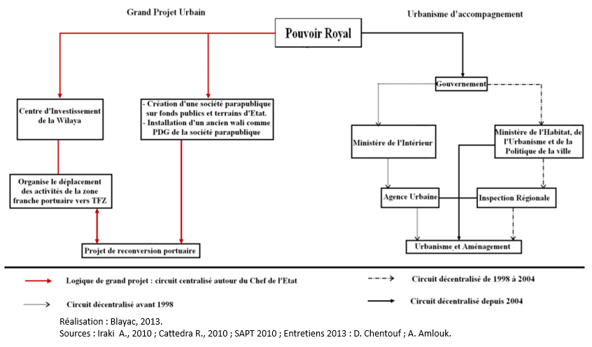 Cet héritage n’est pas étranger au montage de la production urbaine dans le cadre de l’urbanisme de projet. Deux grandes administrations locales sont chargées de l’aménagement et de l’urbanisme : l’Agence Urbaine (AU), longtemps dépendante du Ministère de l’Intérieur, et l’Inspection Régionale (IR), dépendante du Ministère de l’Habitat et de l’Urbanisme. Les deux entités se font concurrence, souhaitant obtenir l’ensemble des prérogatives en matière d’aménagement6. Mais dans un contexte de grand projet urbain demandé par le roi, et en lien avec l’héritage du makhzen, les acteurs locaux n’ont aucune prérogative en rapport avec la reconversion portuaire. Nous observons sur la figure 2 que la reconversion portuaire s’effectue par des organes sous contrôle direct du roi : la wilaya(i.e. préfecture) organise les transferts des entreprises de la zone franche portuaire vers Tanger Free Zone, une zone franche située à proximité de l’aéroport ; la société anonyme en charge de la reconversion, dont la direction est proche du roi.