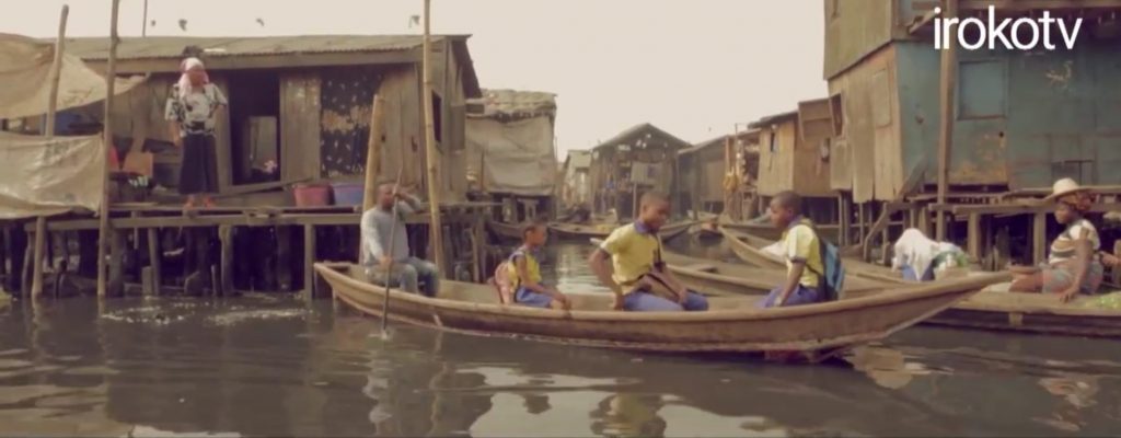 Getting rich in Lagos faisant figure d’exception, les dynamiques urbaines propres à la ville africaine n’apparaissent pas aisément aux yeux du téléspectateur même si les espaces urbains sont très largement représentés et porteurs de sens pour l’intrigue. Si les caractéristiques de l’identité lagotienne sont peu présentes dans les fictions nigérianes, les intrigues rappellent, elles, les réalités lagotiennes, tant sociales qu’économiques voire urbanistiques, notamment dans Getting rich in Lagos, où l’espace urbain apparaît dans son informalité, son insalubrité et sa pauvreté. Makoko, bidonville célèbre par sa situation sur la lagune de Lagos, est aussi marqué par son extension et sa densité de population : plus de 150 000 habitants sur une surface d’environ 70 hectares.