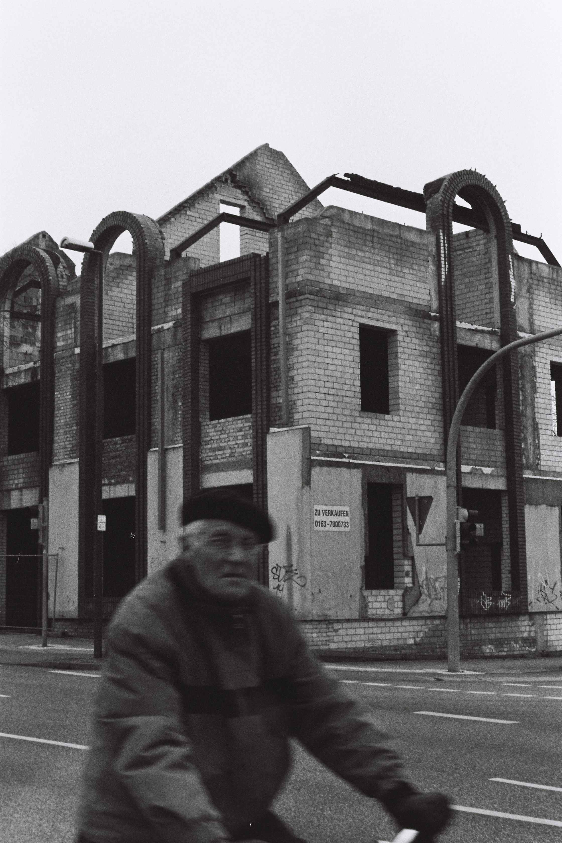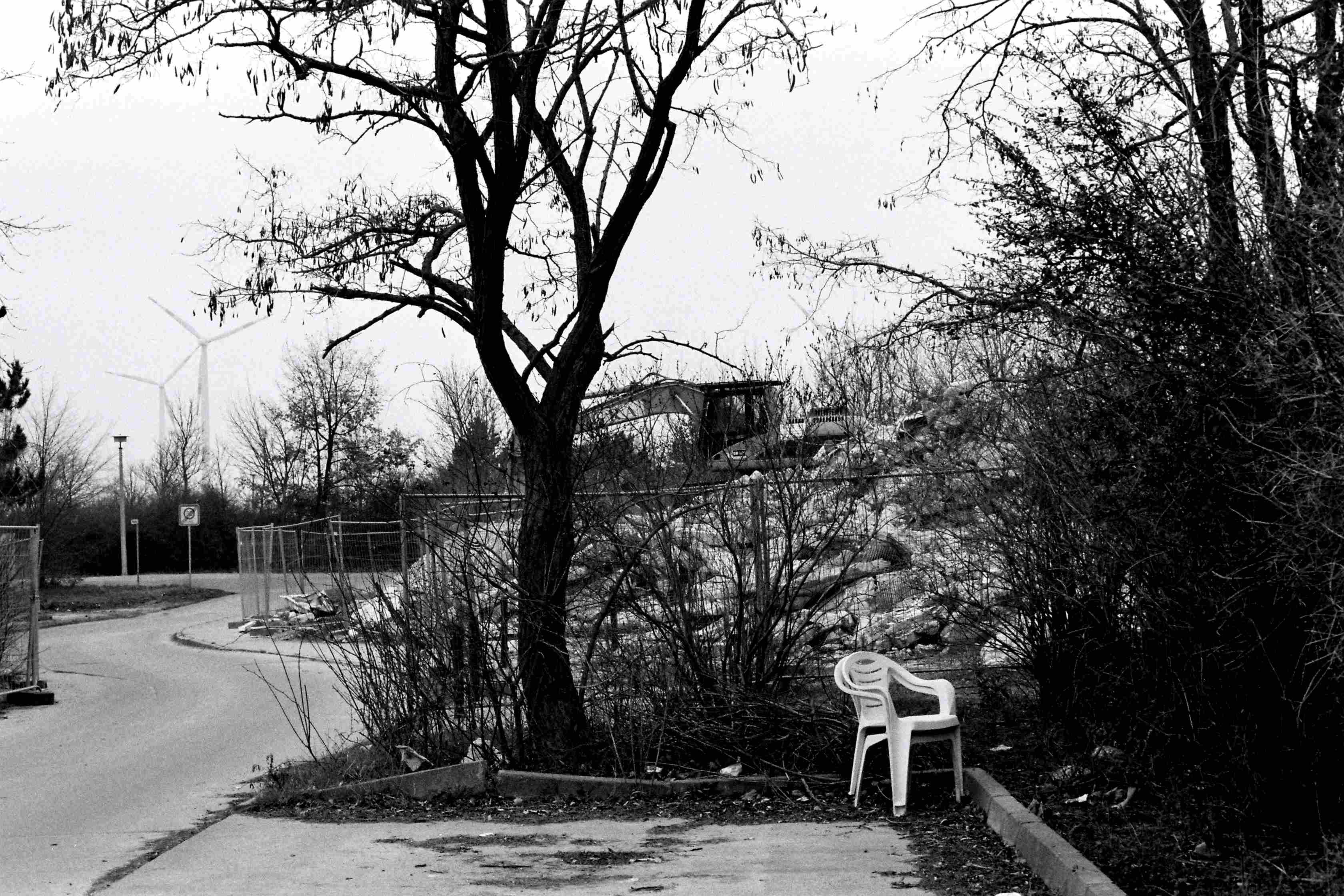 La série s’ouvre sur un ensemble de quatre photos portant sur l’héritage industriel de la ville : vestiges de bâtiments industriels laissés à l’abandon, reconversions de lieux symboliques en lieu de loisir ou de patrimoine. La suite de la série se concentre sur Wolfen-Nord, et sur la vie dans un quartier d’habitation en décroissance. Le quotidien des quelques 8 000 habitant.e.s est rythmé par les déconstructions éclairs d’immeubles vacants, qui font disparaître jusqu’aux fondations des bâtiments et laissent derrière elles des terrains libres, rendus à la nature et classés inconstructibles par les pouvoirs locaux. Les derniers clichés du portfolio se concentrent sur les marques d’habitation et de l’appropriation persistante du quartier par ses habitant.e.s. Çà et là des silhouettes d’hommes et de femmes, de jeux et de bicyclettes sont les indices d’une vie qui continue dans un quartier en constante évolution. L’absence de personnes sur la majorité des photographies présentées reflète notre expérience partielle de ce quartier, parcouru en plein hiver, aux heures où de nombreux habitant.e.s sont soit au travail, à l’école ou chez eux/elles.