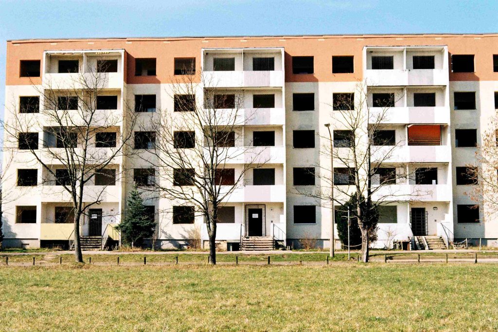 Le quartier de grands ensembles construit pour absorber la croissance démographique, Wolfen Nord, subit particulièrement la crise : il perd 50 % de sa population entre 1998 et 2013, tendance qui se perpétue encore aujourd’hui (STEG Bitterfeld-Wolfen mbH, 2015). Les ménages laissent derrière eux des logements, puis des immeubles entiers vides, et un marché immobilier moribond. Le quartier est alors le théâtre d’un ensemble de politiques visant à gérer cette crise qui s’amplifie, ce qui passe en particulier par la déconstruction des immeubles vacants dans le cadre d’un programme fédéral appelé Stadtumbau Ost (Bernt, 2017; Florentin, 2011). La ville de Bitterfeld-Wolfen aujourd’hui est marquée par cette histoire houleuse, par une décroissance tenace ainsi que par des actions d’aménagement fortes qui marquent le paysage.