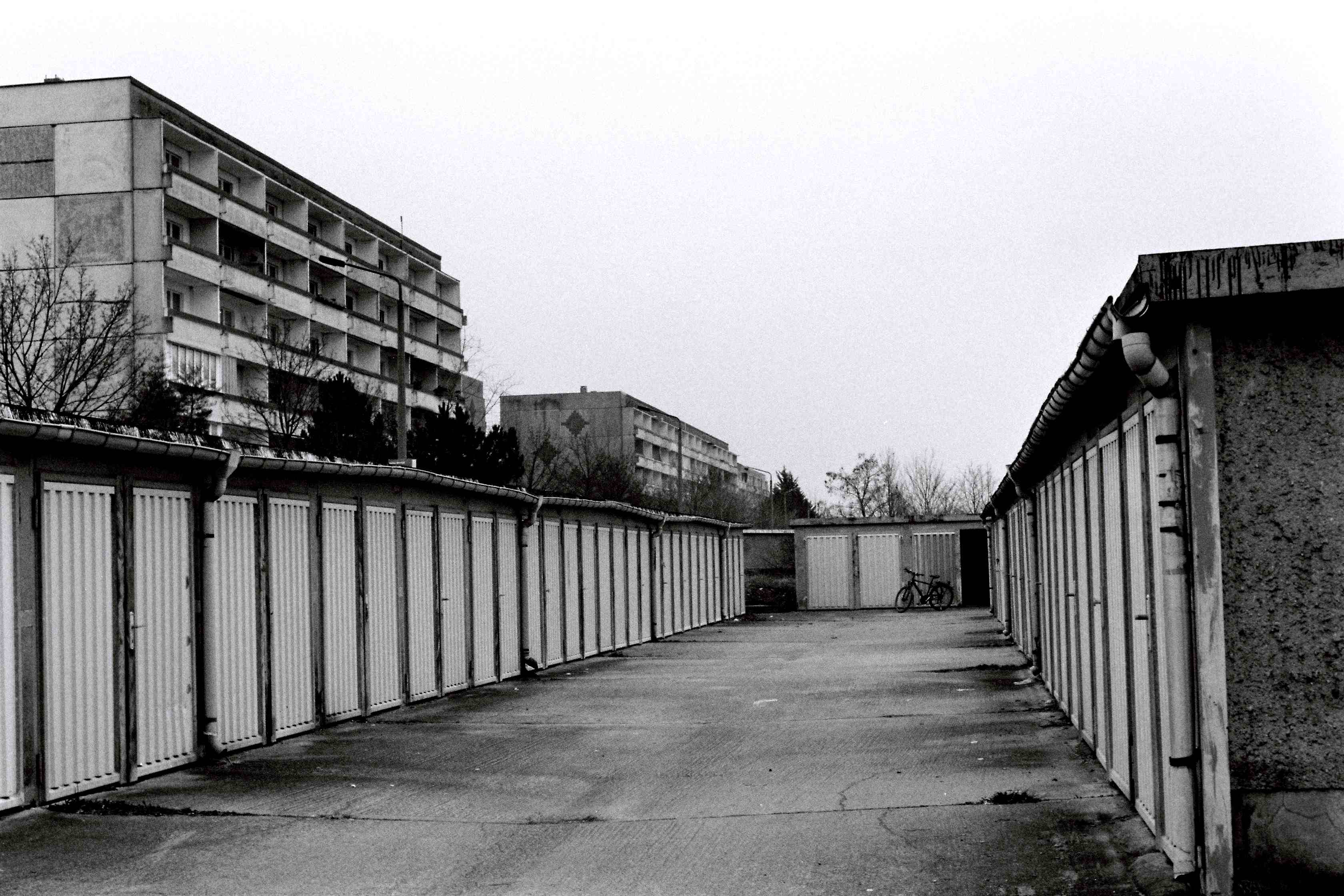 Ces garages, construits en parallèle de logements semblables à ceux en arrière-plan, ont une espérance de vie aujourd’hui très limitée : leur déconstruction est prévue dans le dernier plan d’aménagement du quartier, publié en 2016.