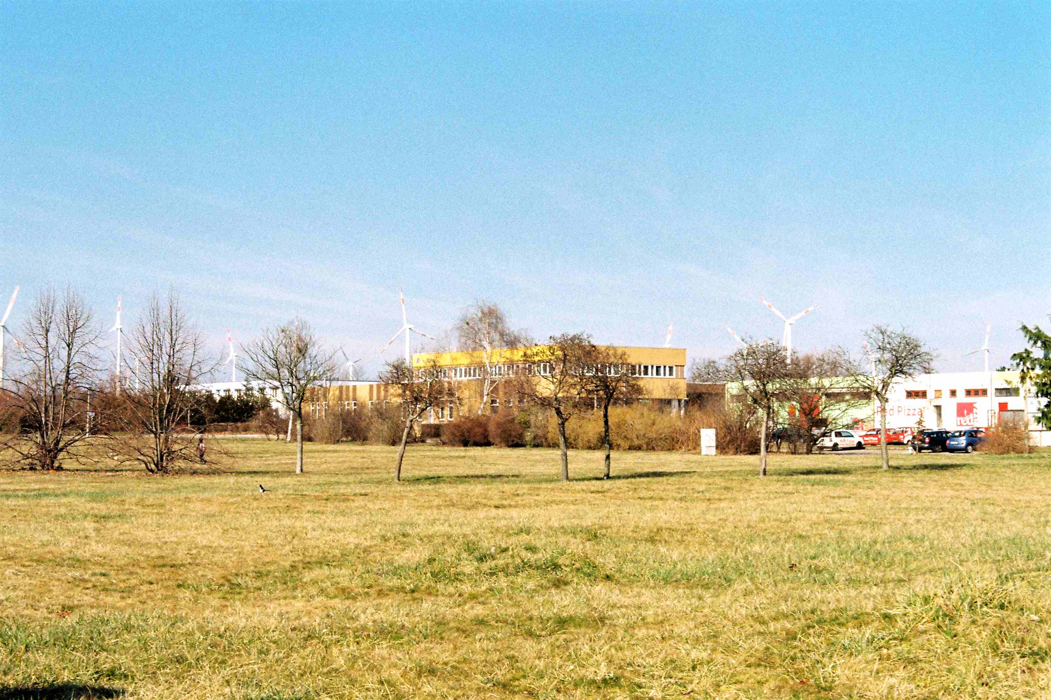 Sur cette parcelle se trouvait une des barres d’immeubles construites à la fin des années 1980. Elle a fait partie des premières détruites dès la moitié des années 2000. Les documents d’urbanisme interdisent toute construction sur ce terrain, consacré à la nature. En arrière-plan, un parc éolien témoigne d’une forme de renouvellement industriel et énergétique de la région, qui ne profite pas pour autant à Wolfen-Nord en crise.