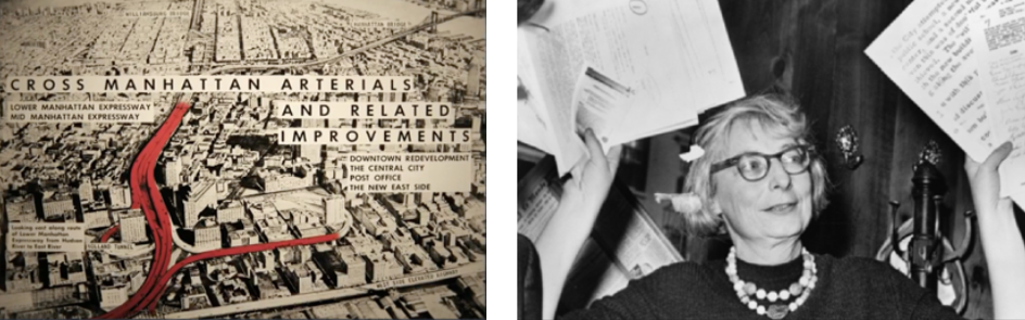 Le tracé de l’artère autoroutière qui menaçait Manhattan ; Jane Jacobs victorieuse après l’annonce de l’abandon du projet (« Citizen Jane : Battle for the City »).