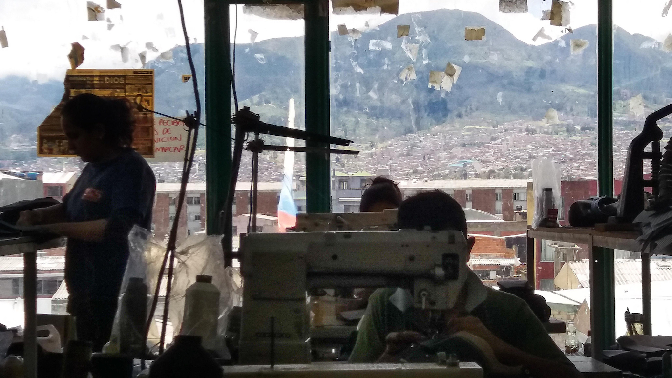 Prise dans l’ombre d’une fabrique de chaussures du quartier de Restrepo, avec en arrière-plan les traces d’une croissance urbaine qui a gagné les reliefs voisins, cette image se différencie des vues qui véhiculent une représentation « standardisée » de la métropolisation.