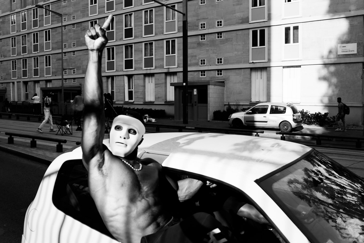 –Sarcelles, symbole de la « cité-dortoir » (Vieillard-Baron 1996), dispose de l’un des premiers et plus imposants grands ensembles de France. Figure des utopies et par la suite des dystopies urbaines (Canteux 2004) l’image de cette ville est incontournable dans la définition visuelle des banlieues françaises. J’ai réalisé cette photographie au cours d’une recherche doctorale sur les pratiques visuelles à Sarcelles (EHESS, 2015-2020). J’ai exploré la ville en tant que chercheur mais aussi en tant que photographe. Cette double casquette m’a permis de vivre autrement les expériences en ville au moyen d’une démarche à la fois pragmatique et créative. J’ai réalisé cette photographie quand la France a gagné la Coupe du Monde de Football de 2018. Dans une ambiance de fête généralisée, les corps s’engagent autrement aux espaces du quotidien. Dans l’euphorie collective la ville est vue et vécue autrement par les Sarcellois-es.