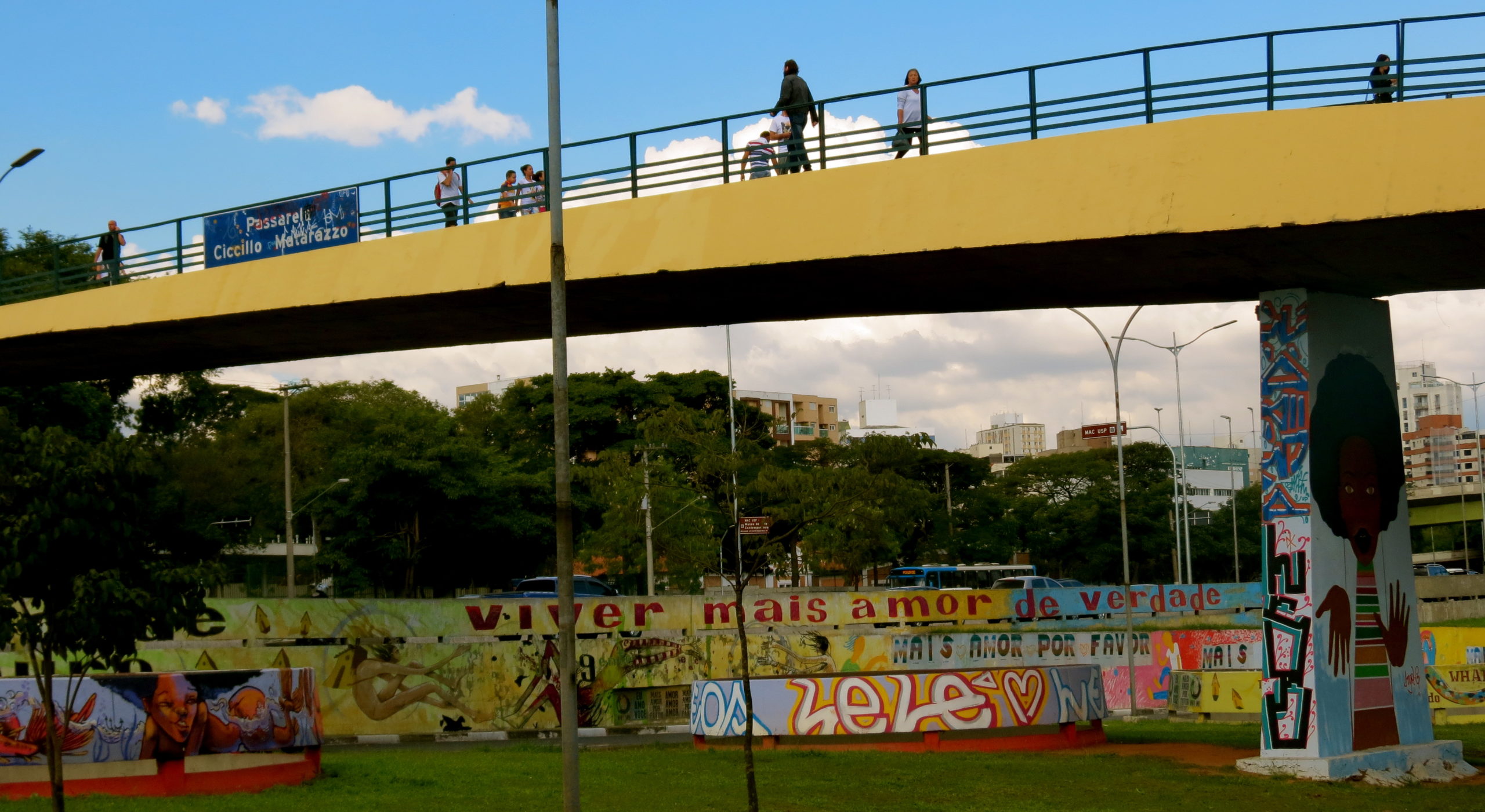 Photo de la Passerelle Ciccillo Matarazzo à São Paulo, 2016. Cette passerelle piétonne relie le Musée d’Art Contemporain de São Paulo au Parc Ibirapuera, l’un des plus grand de cette ville tentaculaire, en passant par-dessus une grande artère de la ville. Prise dans le contexte d’une recherche sur les pratiques culturelles et artistique des jeunes au Brésil, elle reflète l’urbanité et la place des corps, en passage, dans une ville construite autour de l’automobile. Les corps y sont aussi présents dans les fresques urbaines et dans les messages écrits demandant « plus d’amour s’il vous plaît » ou de « vivre plus d’amour véritable / vraiment plus d’amour ». La prégnance de la représentation du corps humain et de messages symbolisant le besoin d’affection détone dans le cadre ultra-urbanisé de l’Avenue du 23 mai, réputée à la fois pour être un axe embouteillé, bruyant et dangereux et pour être le « plus grand mur de graffitis à ciel ouvert » d’Amérique latine.