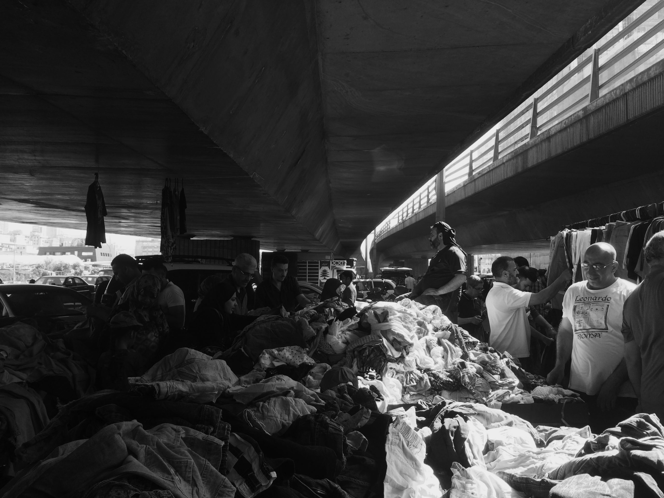 « Aya pantalon ramse telef, ramse telef » (« Tous les pantalons à 5,000 livres libanaises, 5,000 livres libanaises !», soit 3 euros environ) s’égosille une voix dans un haut-parleur perché sur une pile de vêtements de seconde-main déposés en vrac sur une table faite de bric et de broc. La pluie n’a pas eu raison des piaillements des oiseaux en cage, auxquels se mêlent les klaxons des automobilistes et les vrombissements des scooters qui circulent sur le pont de l’autoroute Beyrouth-Damas. À gauche des oiseaux, un étal propose multiprises, chargeurs, écouteurs et sèche-cheveux. Deux jeunes hommes y fument le narguileh ; le vieil homme d’à côté grille une blonde, un café à ses pieds. L’aiguille remplace la clope dans la bouche du couturier voisin qui s’attèle à repriser un vieux jean. Le vendeur de café parcourt, quant à lui, les sinueuses allées du suq, entrechoquant les tasses comme des castagnettes. L’odeur du café à la cardamome se mêle à celle du snack où cuisent quelques falafels. Au bourdonnement de l’essaim de la foule se confond le murmure du dermographe que fait danser un tatoueur sur l’avant-bras d’un jeune homme au corps déjà bien empreint d’encre noir. La cadence des pas est saccadée par l’évitement des flaques d’eau qui ont pris possession du terrain au bitume détérioré. C’est un sombre jour de pluie. Suq al-Ahad (signifie « marché du dimanche » : il se tient chaque week-end, du vendredi au dimanche soir, en périphérie Est de Beyrouth.), Beyrouth.