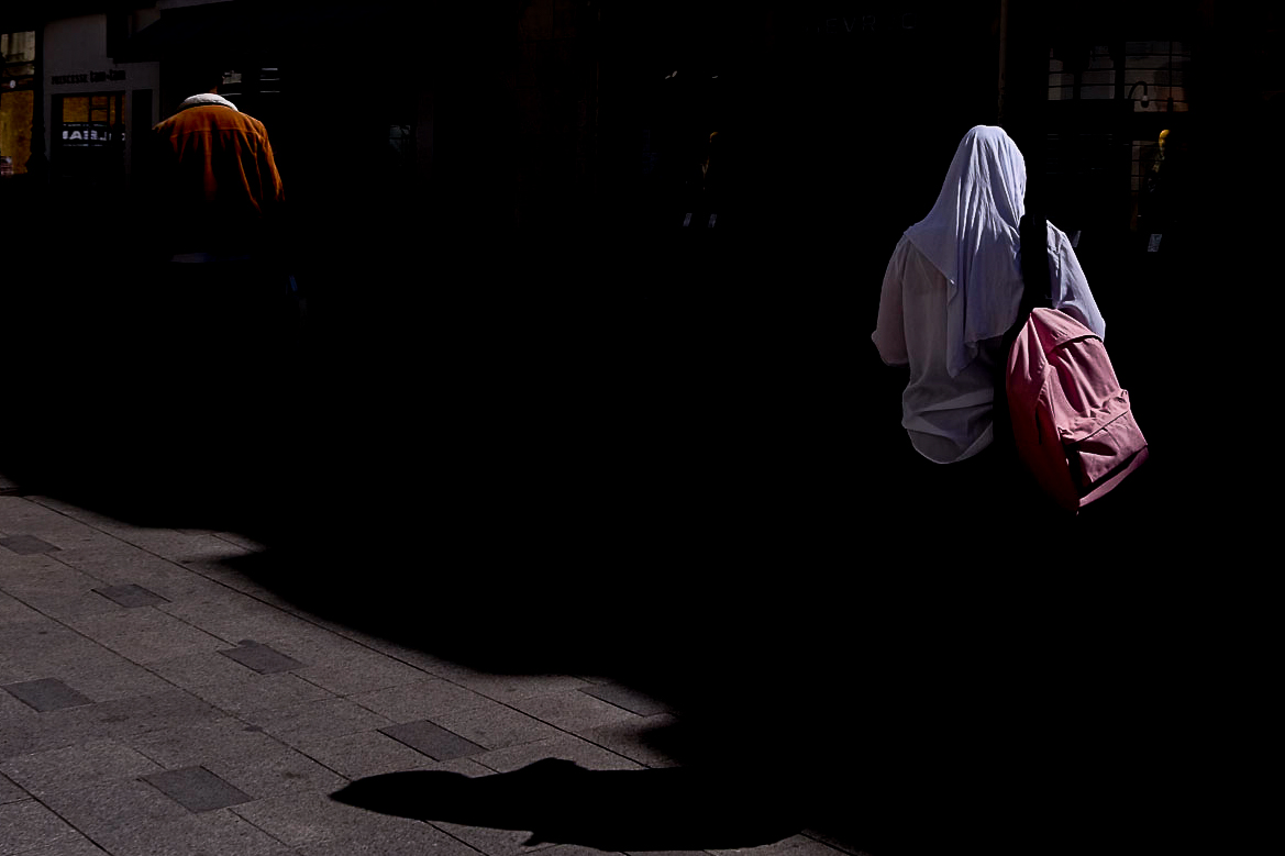 Dans cette photo, deux corps se tiennent entre l’ombre et la lumière, ils portent ou sont portés par leurs vêtements. La jeune fille surtout, avec son sac d’école rose, est baignée dans la lumière qui met en évidence la blancheur de ce vêtement si polémique dans la vie et les villes françaises.