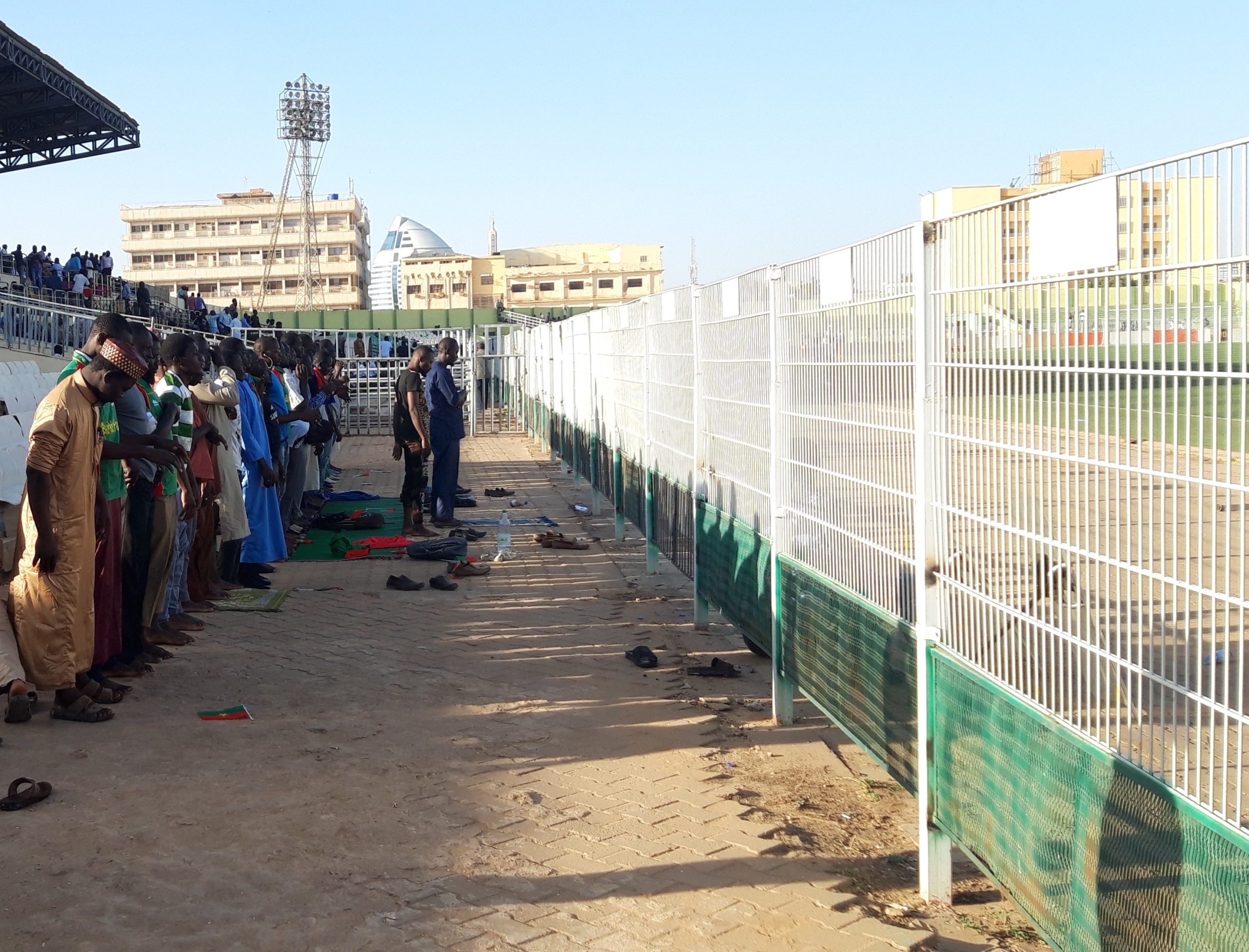 A la mi-temps, le Burkina Faso mène 1-0. Les étudiants se réunissent devant les gradins pour la prière. J’attends sur le côté que le match reprenne.
