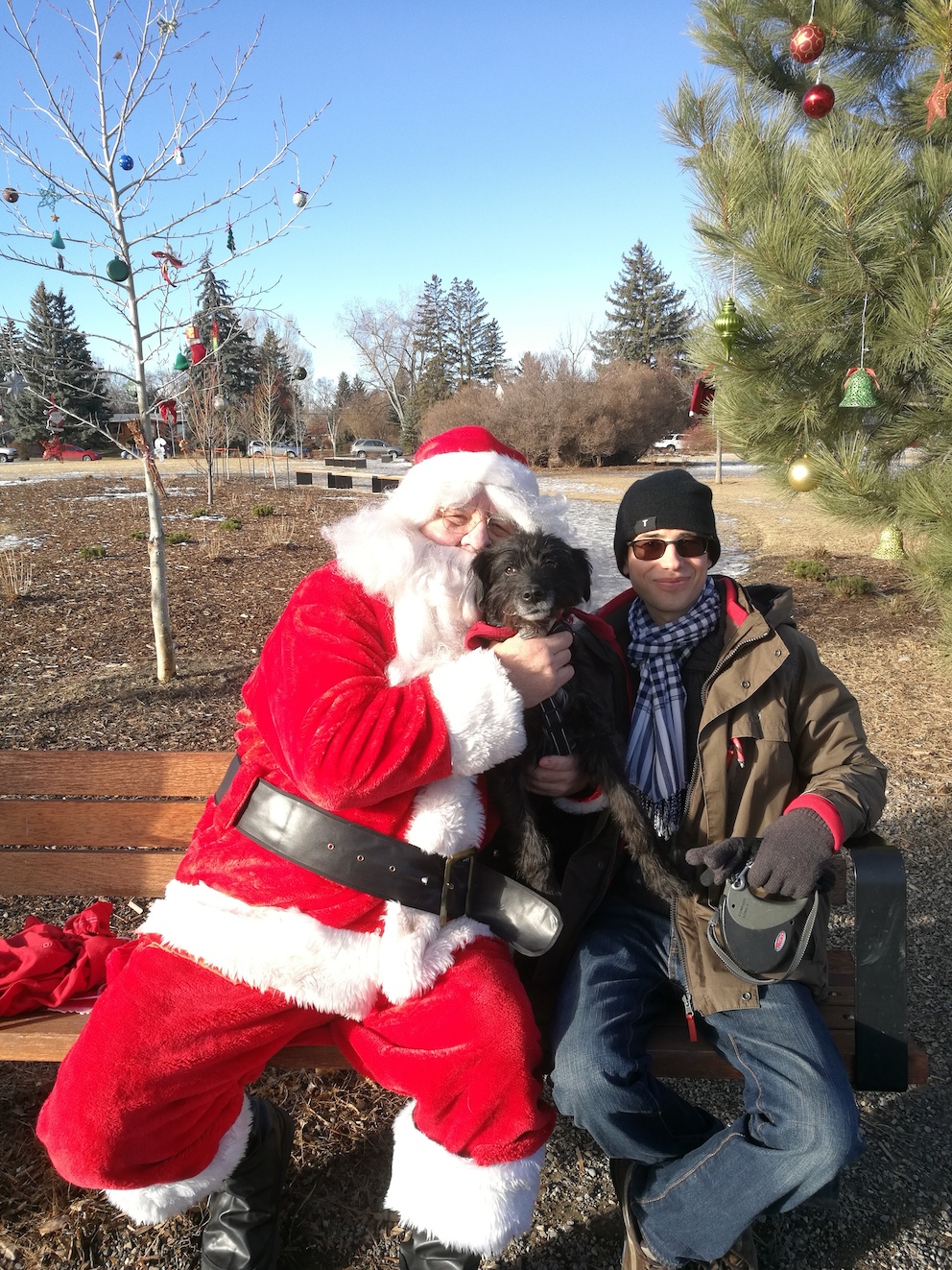 Ça fait 30 minutes que je m’entretiens avec la présidente d’une association de résident·e·s créée pour défendre le statut de River Park (Calgary, AB, Canada), qui autorise la promenade de chiens sans laisse. La municipalité envisage de révoquer ce statut, et des habitant-e-s se mobilisent. Ce dimanche, ils ont organisé un goûter de Noël pour médiatiser leur action. Ils ont même fait venir un Père Noël vers lequel les propriétaires de chiens se pressent avec leur animal, pour qu’on les prenne en photo. C’est kitsch à souhait.