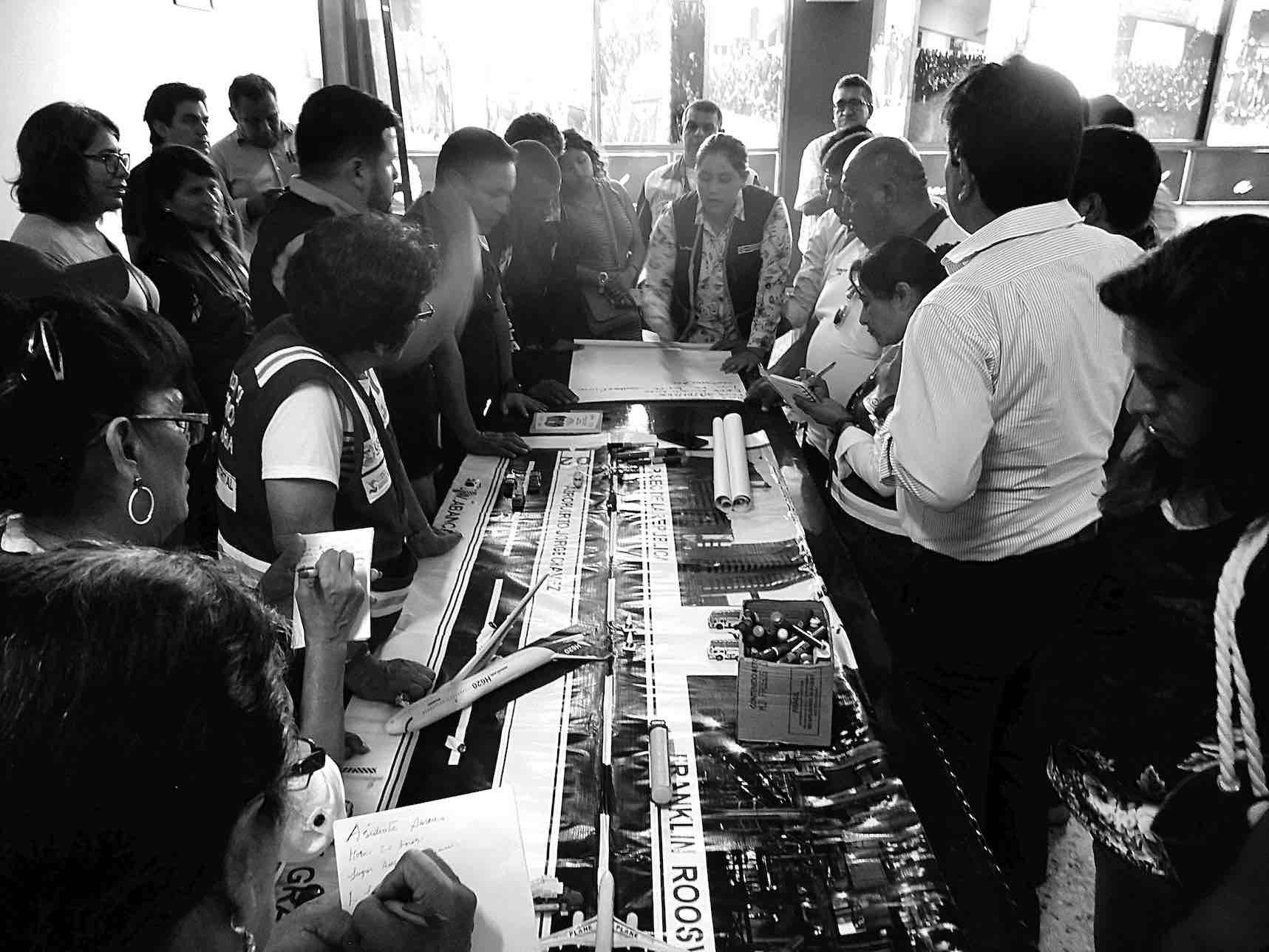 A l’occasion d’une simulation de gestion de crise dans le quartier Rimac de Lima, nous avons pu observer le jeu d’acteurs impliqués à différentes échelles. Nous assistons donc à la reconstruction d’un état d’alerte et de réponse à une crise comme celle qui suit la chute d’un avion. Une petite maquette d’un avion renversé sur la table et la demande faite aux acteurs présents, des diverses institutions, de simuler une réponse, est la représentation sous nos yeux. En respectant un protocole très strict, les bénévoles de la population civile sont appelés à interagir avec les représentants de la protection civile pour déclencher l’opération de secours. Le théâtre de cette scène fait émerger les conflits et les alliances qu’il serait difficile d’observer dans une vraie catastrophe. Dans ce théâtre, la représentation de ces acteurs et leur rôle institutionnel se personnifient, en devenant très humain, et pour cette raison aussi riche de contradictions et d’actes imprévisibles.