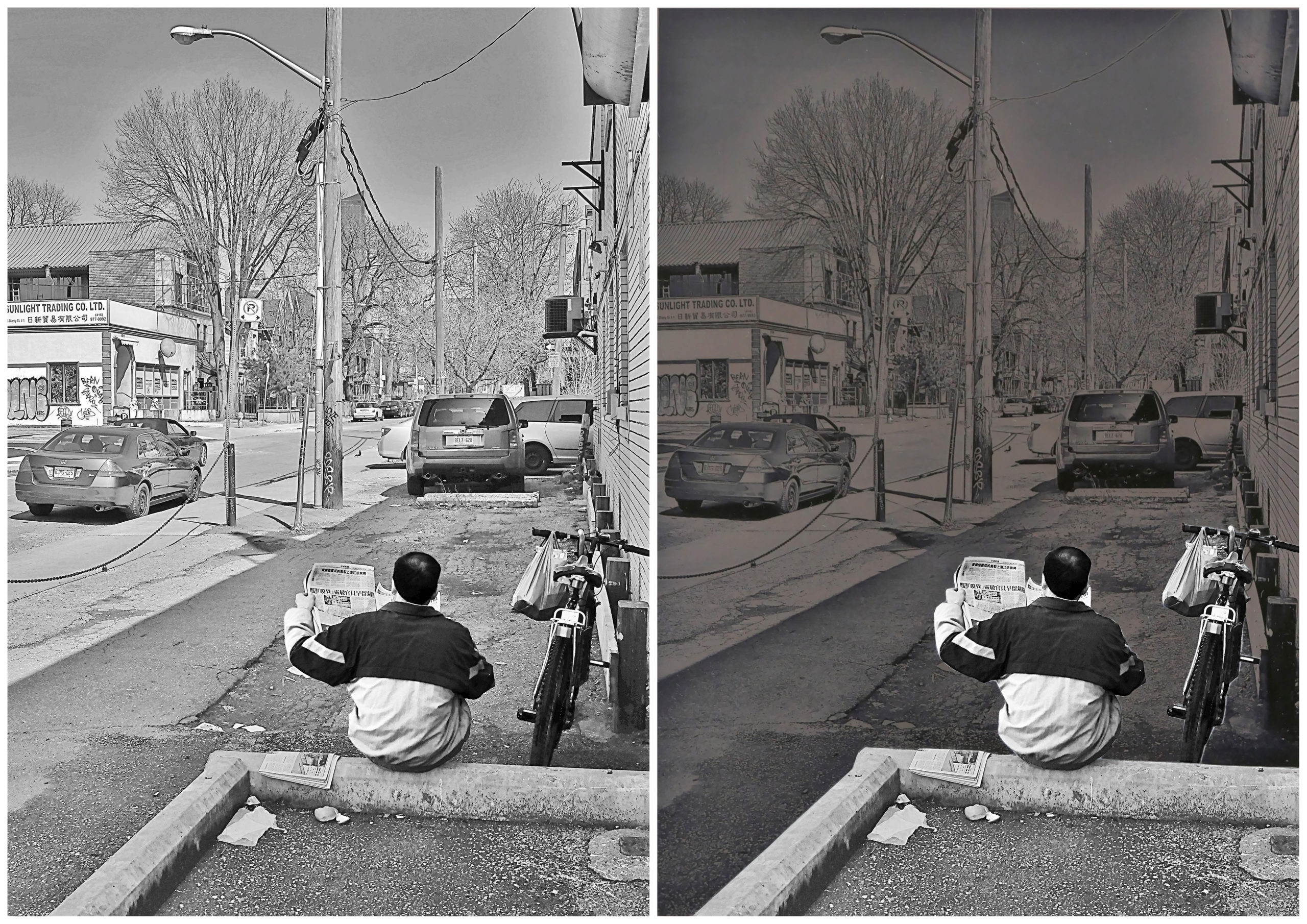 La photographie a été prise en 2015 dans le quartier chinois de Toronto, Canada. Le cycliste semble avoir décidé de faire une pause après avoir