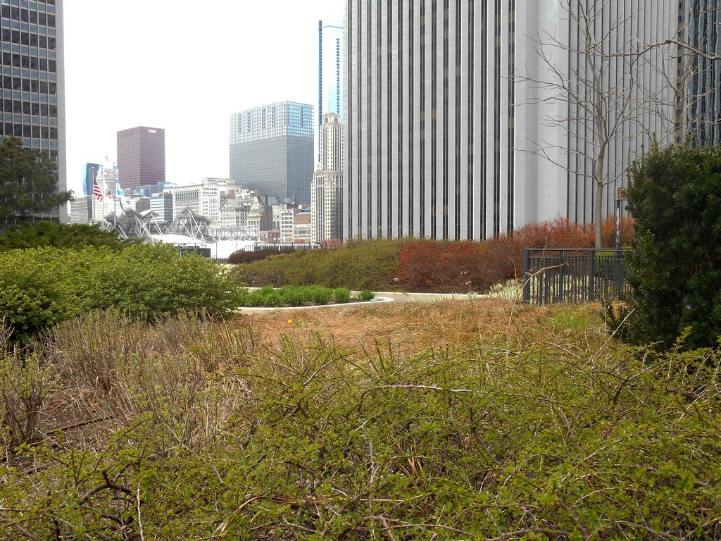 Photo 15. 255 E Grand Avenue (Beaufils, 2015). Au cœur des verticalités urbaines chicagoanes, le toit végétalisé, notamment dans sa variante de garden rooftop, permet de repenser les systèmes d’étagements architecturaux qui ont fait la renommée de la ville.