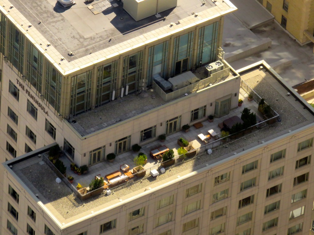 Photo 2. Peninsula Hotel (Burgel, 2015). Le garden roof selon la municipalité : une terrasse suspendue agrémentée par des plantes en pot, premier effort pour réduire l’effet d’îlot de chaleur urbain