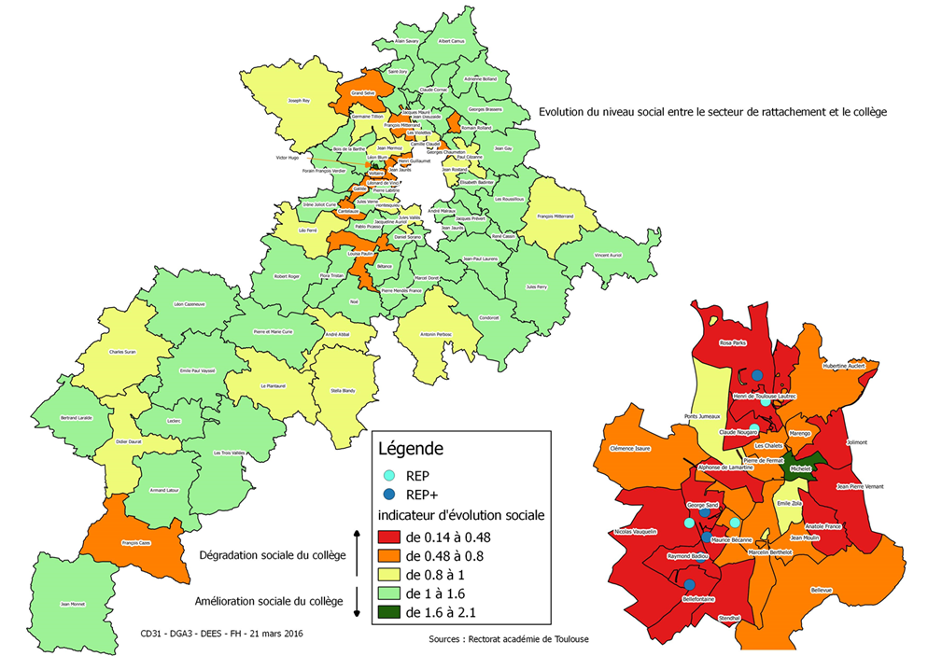 « La sectorisation classique étant fondée sur le territoire de proximité, une urbanisation ségrégative se traduit automatiquement par une absence de mixité sociale au sein des collèges. Or, la géographie des quartiers toulousains montre que les quartiers favorisés et les quartiers défavorisés, au sens des catégories socioprofessionnelles qui y habitent, sont rarement contigus. Ces territoires sont en effet séparés par des zones relativement mixtes, dans lesquelles les collèges bénéficient aussi d’une relative mixité. Dans ce contexte, modifier les frontières des secteurs de recrutement des collèges publics induisait de profonds changements pour les familles sans pour autant résoudre le problème : l’impact sur les collèges très défavorisés aurait été marginal, alors que les collèges relativement mixtes dans les zones intermédiaires auraient été fragilisés du point de vue de leur composition sociale » (Calazel, 2021 : 178).