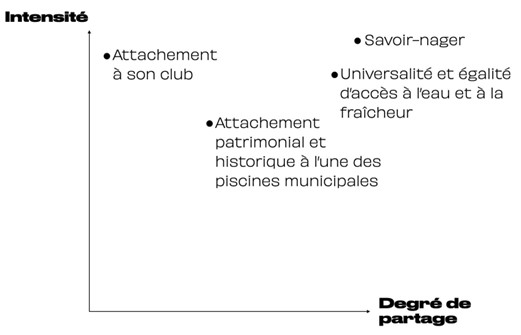 L’enquête a dès lors consisté à identifier les attachements qui naturalisent, reproduisent et justifient le retour à cinq piscines municipales (voire la construction de nouveaux centres aquatiques). L’universalité et l’égalité de l’accès à l’eau et à des lieux de fraîcheur, la piscine collective comme lieu de socialisation et de mixité sociale, la nage comme pratique de rééducation ou de maintien en forme pour des personnes en situation de handicap sont autant d’exemples d’attachements qui ont été constatés lors de l’enquête. Nous les avons ensuite triés selon deux axes, leur intensité (à quel point cet attachement est-il éprouvé par une personne ?) et leur degré de partage (combien de personnes éprouvent cet attachement ?). Attardons-nous sur trois d’entre eux.
