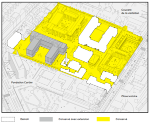 Les architectes-urbanistes qui se sont succédé – l’atelier Xavier Lauzeral jusqu’en 2015, l’agence Anyoji Beltrando depuis – ont mené une analyse attentive et détaillée des qualités du site. Leur proposition choisit de faire dialoguer au sein de l’enclos historique un bâti majoritairement conservé et des îlots contemporains. Il en a résulté en 2016 un accord avec l’aménageur et la collectivité pour augmenter les surfaces bâties conservées : alors qu’elles correspondaient initialement à 45 % de la surface de plancher totale des bâtiments existants, elles représentent désormais 60 % du total. Ce chiffre, largement utilisé dans les communications ultérieures du projet, témoigne de l’importance attribuée à l’objectif de conservation patrimoniale, et se conjugue progressivement à l’intérêt environnemental que représente le recyclage du bâti existant. La question environnementale est également à l’origine de la proposition de renforcer, dans la programmation, les connexions avec les réservoirs écologiques contigus du couvent de la Visitation, de l’infirmerie Marie-Thérèse et du cimetière Montparnasse.