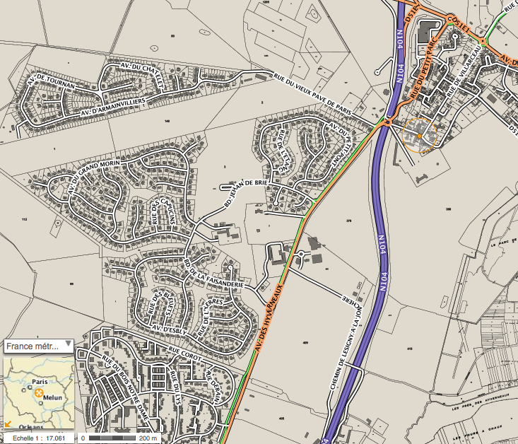 2. Plan de la Résidence du Parc de Lésigny (77), lotissement ouvert par Levitt en 1968. À l’est, l’autoroute périphérique la Francilienne, ouverte dix ans plus tard, sépare le lotissement du vieux village. (Géoportail, 2015).