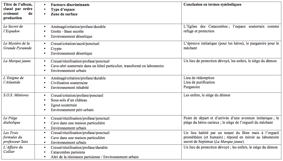 Le premier critère qui s’impose de fait est le type d’espace souterrain parcouru par les différents personnages. Une première distinction suggère d’établir deux catégories : l’espace aménagé à partir d’une cavité naturelle et le construit ex-nihilo. Par exemple, la base secrète du « Monde libre », dans Le Secret de L’Espadon, est le résultat de l’aménagement d’une grotte naturelle, sous une falaise.